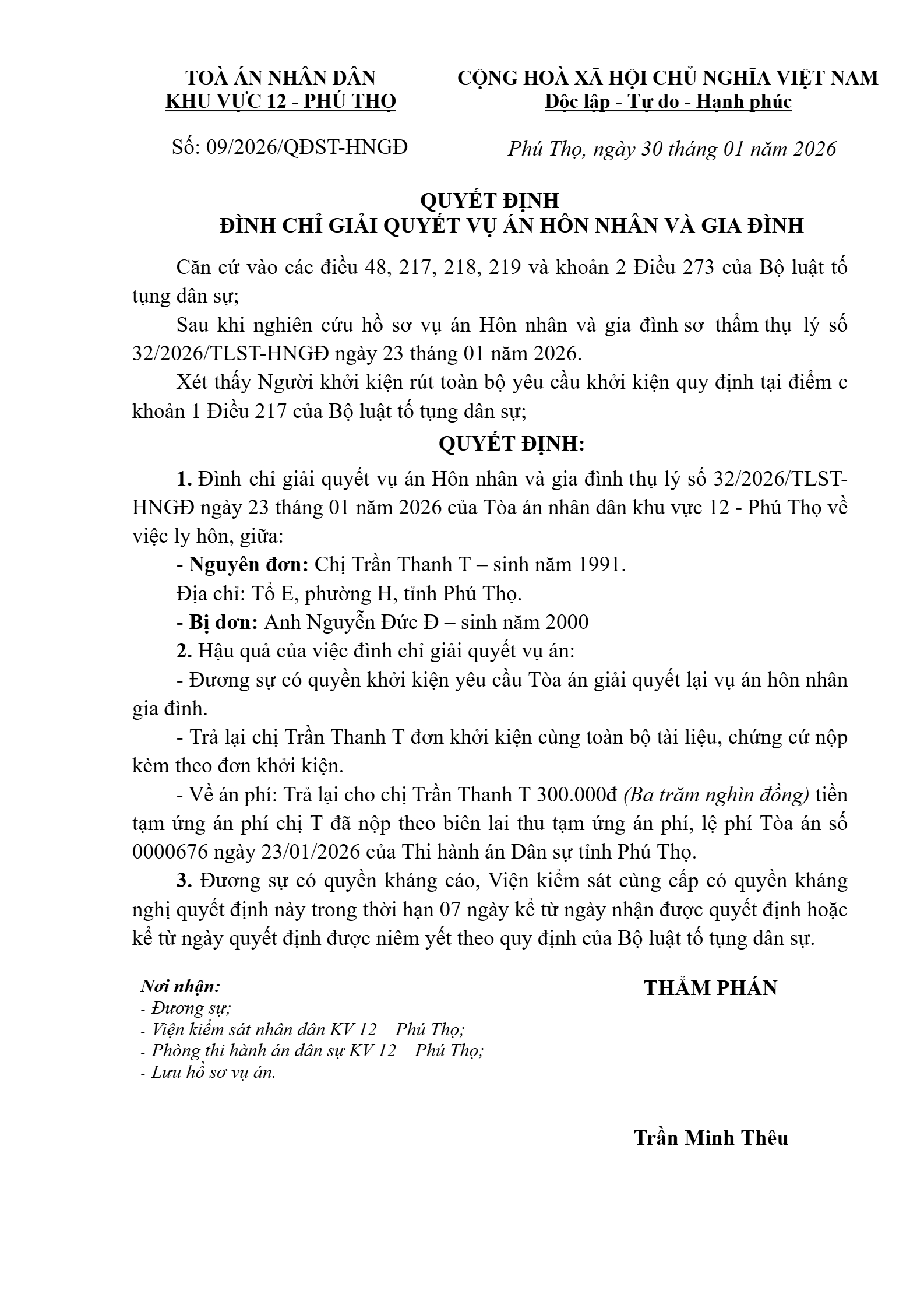 Quyết định số 09/2026/QĐST-HNGĐ ngày 30/01/2026 của Tòa án nhân dân khu vực 12 - Phú Thọ, tỉnh Phú Thọ về vụ án ly hôn về mâu thuẫn gia đình