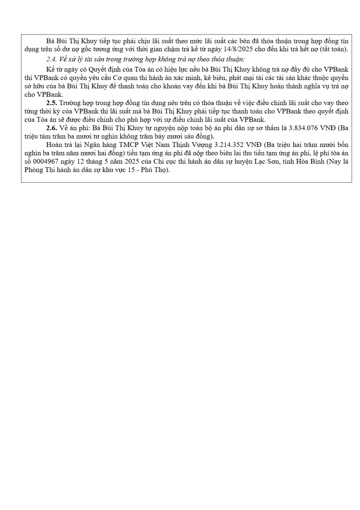 | Thông tin về vụ/việc: | VPB tranh chấp hợp đồng tín dụng với chị Bùi Thị Kh |