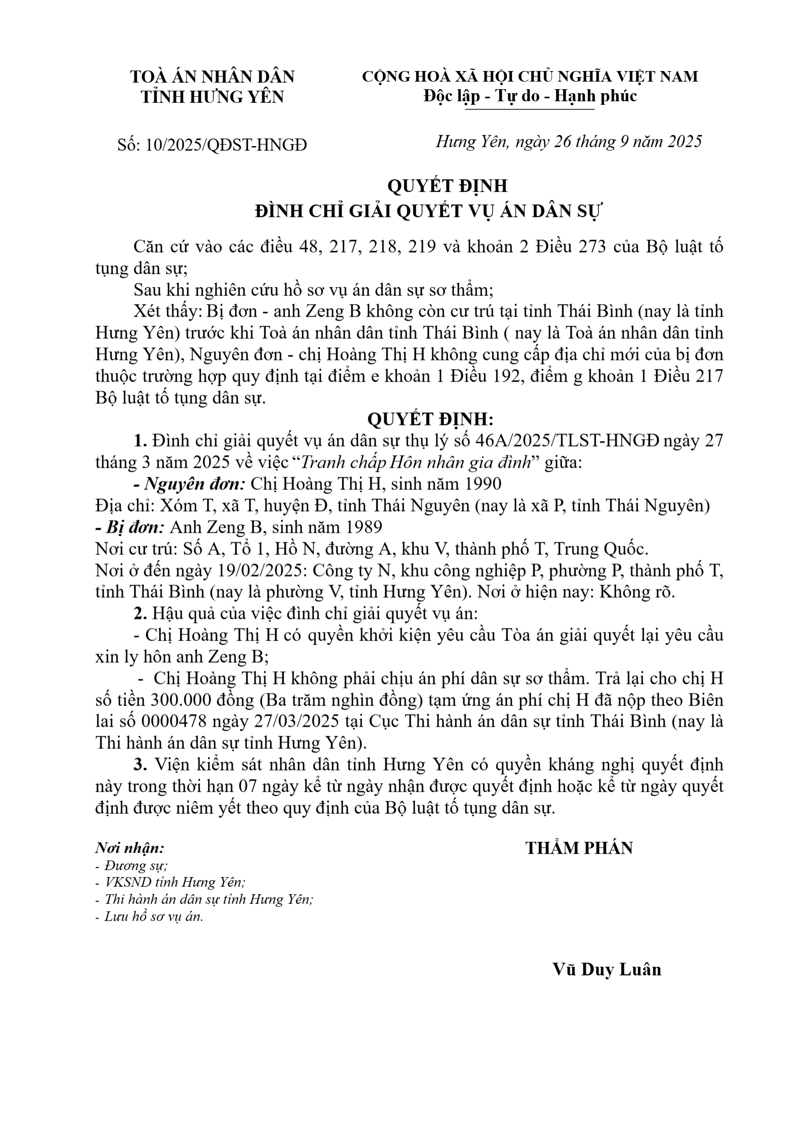 | Thông tin về vụ/việc: | Quyết định đình chỉ H-Z |