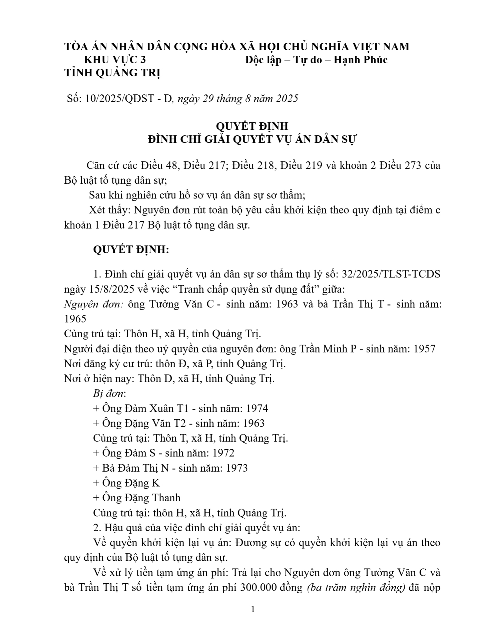 Quyết định số 10/2025/QĐST-DS ngày 29/08/2025 của Tòa án nhân dân khu vực 3 - Quảng Trị, tỉnh Quảng Trị về tranh chấp quyền sử dụng đất