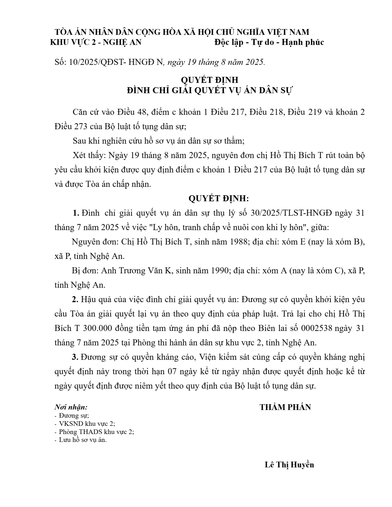 Quyết định số 10/2025/QĐST-HNGĐ ngày 19/08/2025 của Tòa án nhân dân khu vực 2 - Nghệ An, tỉnh Nghệ An về vụ án ly hôn về mâu thuẫn gia đình