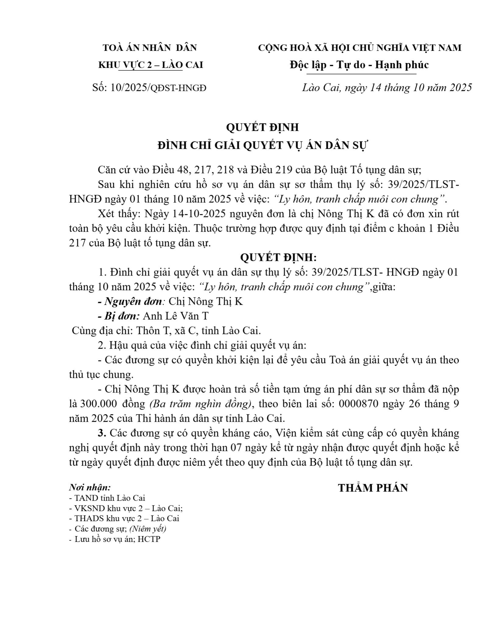 Quyết định số 10/2025/QĐST-HNGĐ ngày 14/10/2025 của Tòa án nhân dân khu vực 2 - Lào Cai, tỉnh Lào Cai về vụ án ly hôn về mâu thuẫn gia đình