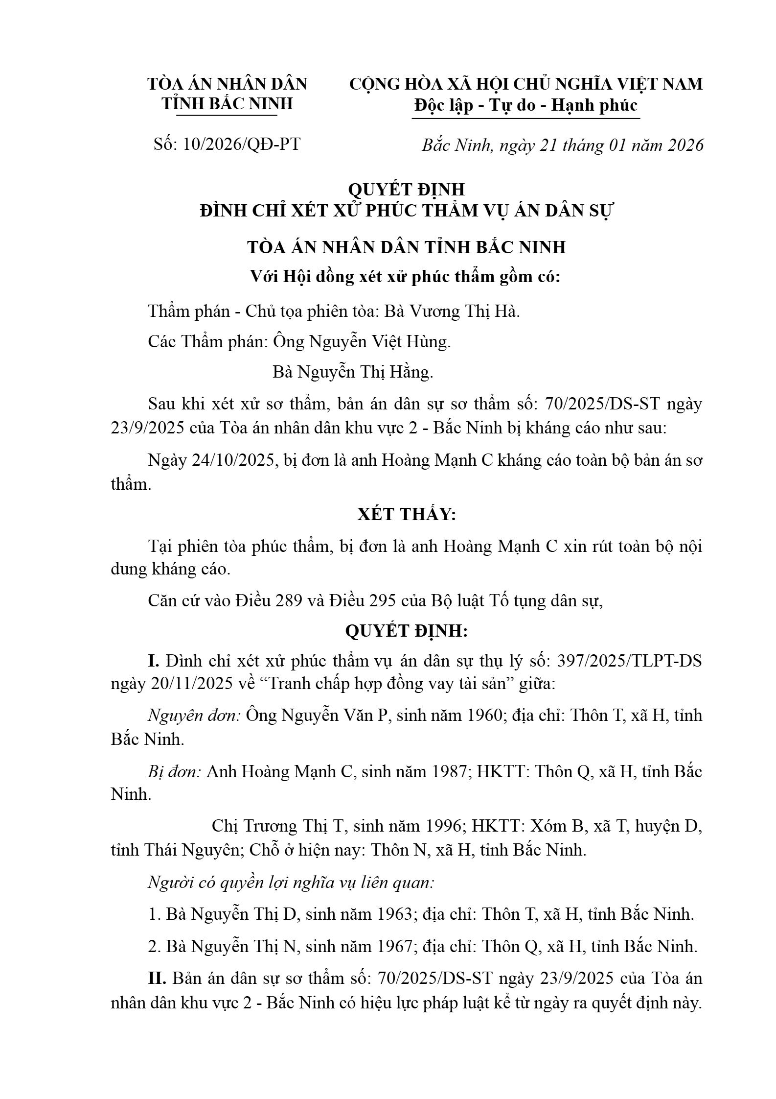 | Tên Quyết định: | Quyết định số 10/2026/QĐPT-DS ngày 21/01/2026 của TAND tỉnh Bắc Ninh về tranh chấp hợp đồng vay tài sản |
