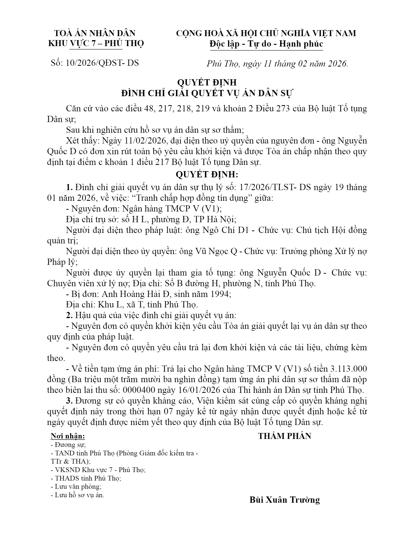 | Tên Quyết định: | Quyết định số 10/2026/QĐST-DS ngày 11/02/2026 của Tòa án nhân dân khu vực 7 - Phú Thọ, tỉnh Phú Thọ về tranh chấp hợp đồng tín dụng |