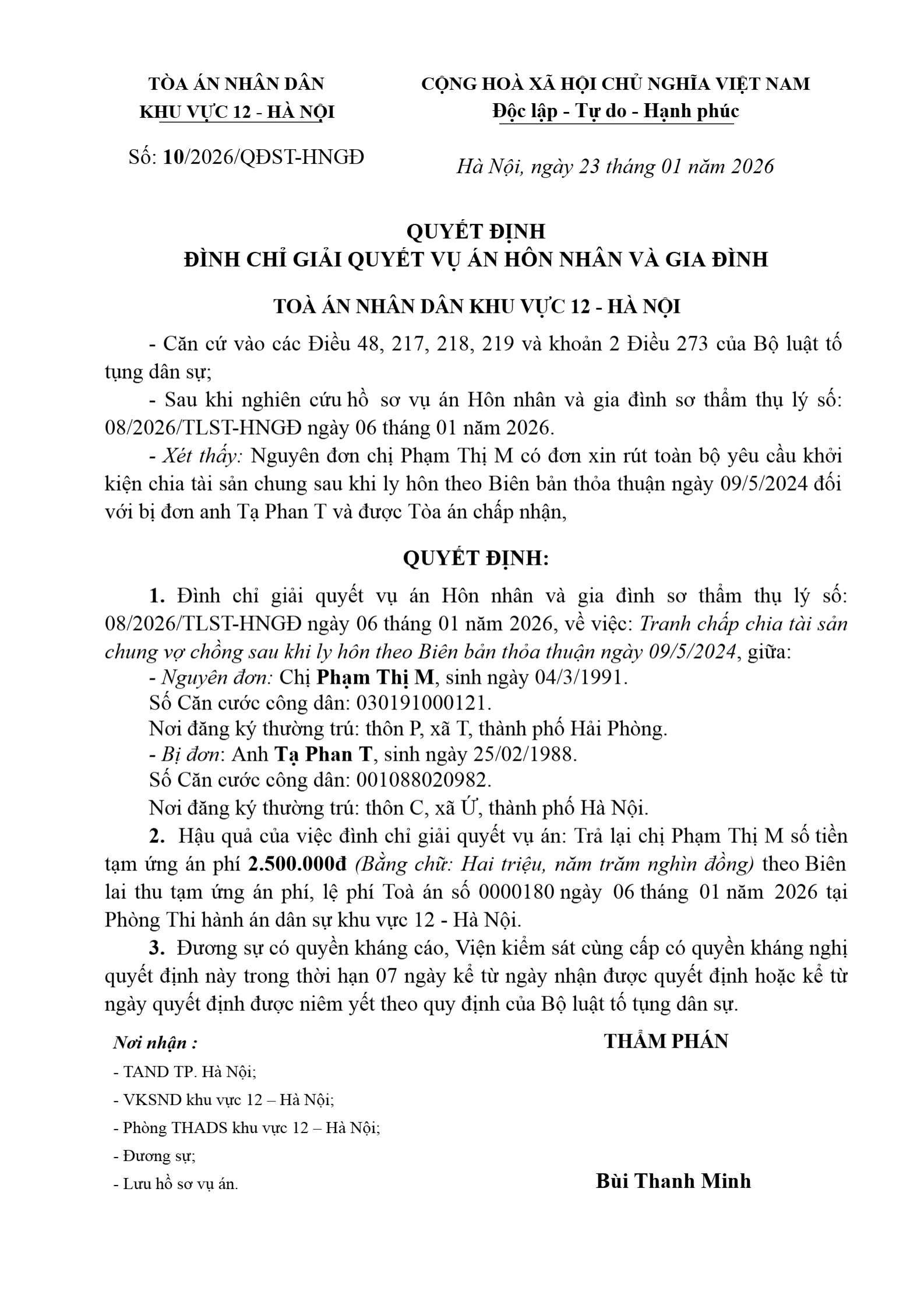 Quyết định số 10/2026/QĐST-HNGĐ ngày 23/01/2026 của Tòa án nhân dân khu vực 12 - Hà Nội, TP. Hà Nội về vụ án ly hôn về mâu thuẫn gia đình