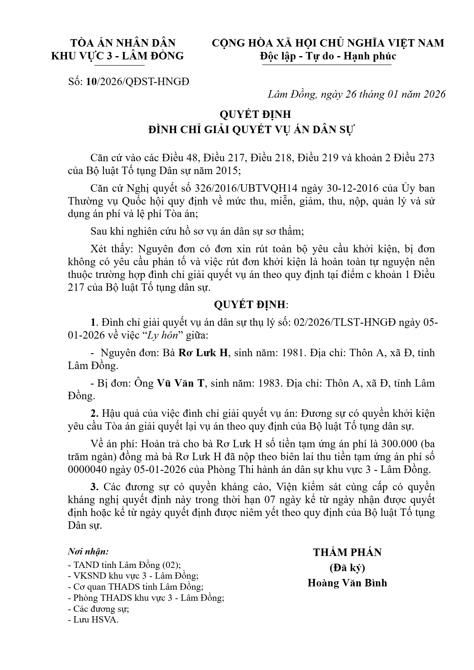 Quyết định số 10/2026/QĐST-HNGĐ ngày 26/01/2026 của Tòa án nhân dân khu vực 3 - Lâm Đồng, tỉnh Lâm Đồng về vụ án ly hôn về mâu thuẫn gia đình