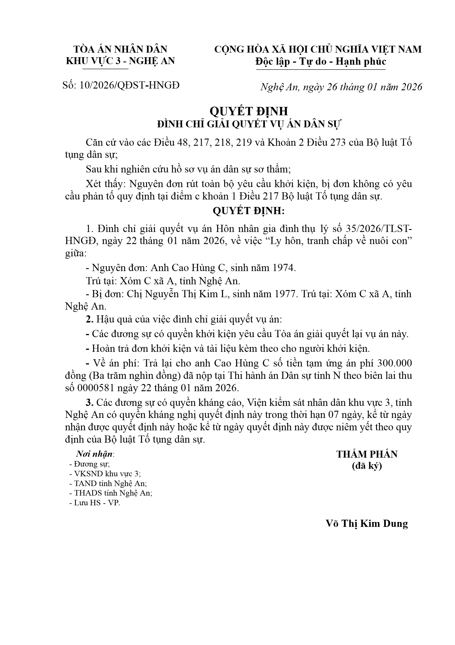 Quyết định số 10/2026/QĐST-HNGĐ ngày 26/01/2026 của Tòa án nhân dân khu vực 3 - Nghệ An, tỉnh Nghệ An về vụ án ly hôn về mâu thuẫn gia đình
