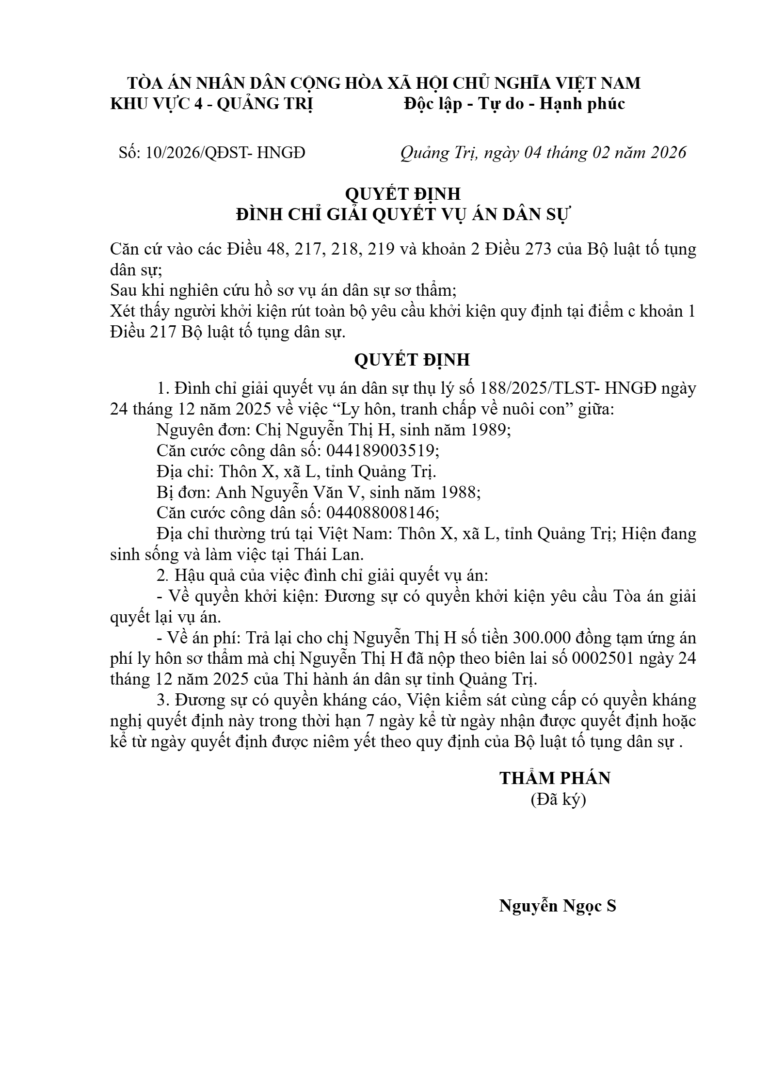 Quyết định số 10/2026/QĐST-HNGĐ ngày 04/02/2026 của Tòa án nhân dân khu vực 4 - Quảng Trị, tỉnh Quảng Trị về vụ án ly hôn về mâu thuẫn gia đình