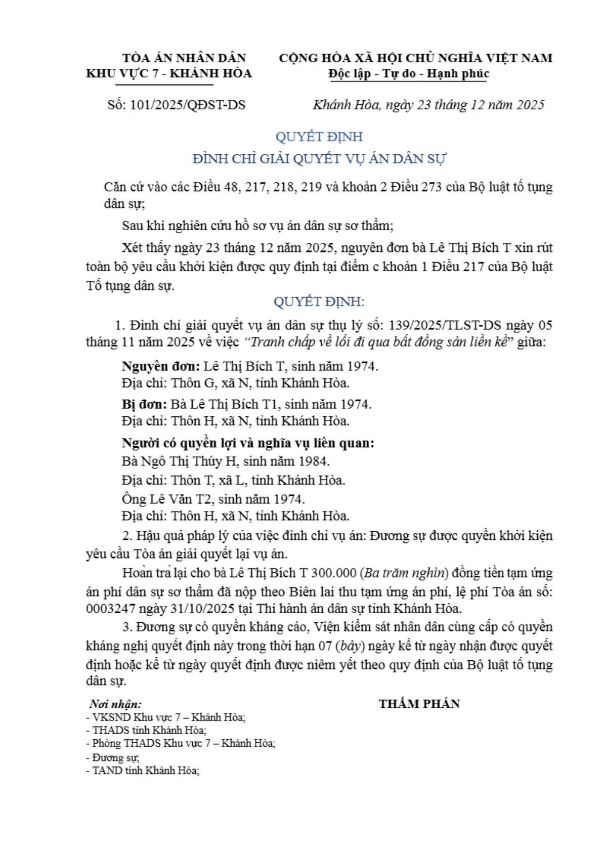 Quyết định số 101/2025/QĐST-DS ngày 23/12/2025 của Tòa án nhân dân khu vực 7 - Khánh Hòa, tỉnh Khánh Hòa về tranh chấp đất đai