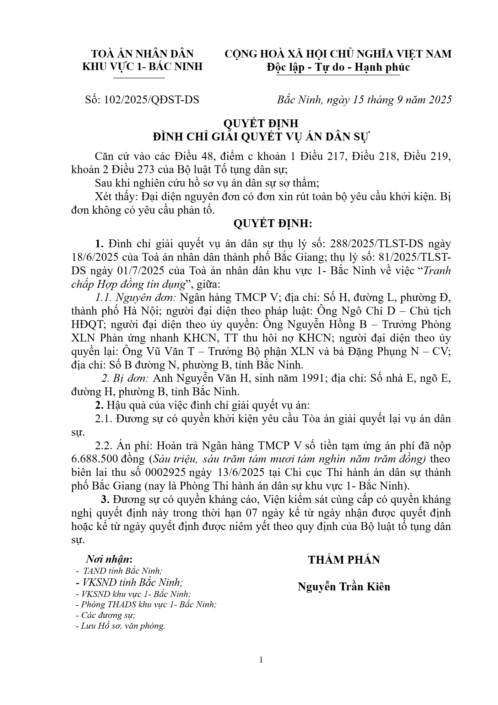 Quyết định số 102/2025/QĐST-DS ngày 15/09/2025 của Tòa án nhân dân khu vực 1 - Bắc Ninh, tỉnh Bắc Ninh về tranh chấp hợp đồng tín dụng