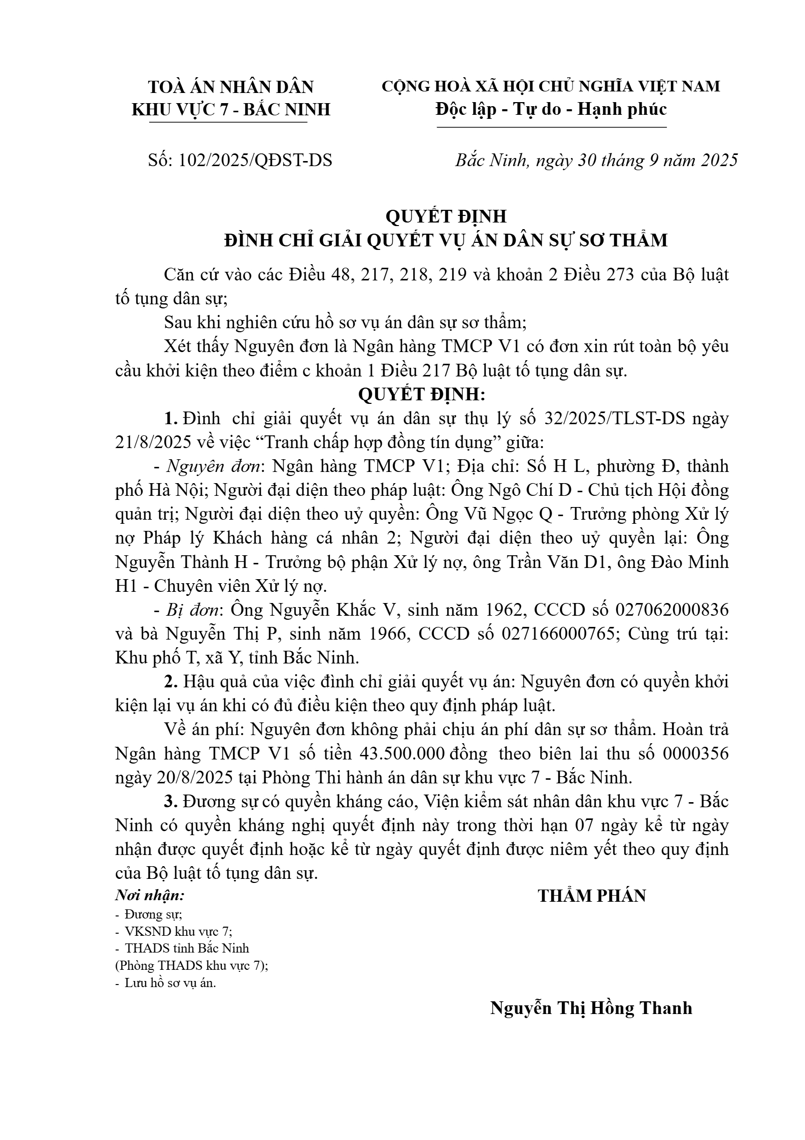 Quyết định số 102/2025/QĐST-DS ngày 30/09/2025 của Tòa án nhân dân khu vực 7 - Bắc Ninh, tỉnh Bắc Ninh về tranh chấp hợp đồng tín dụng