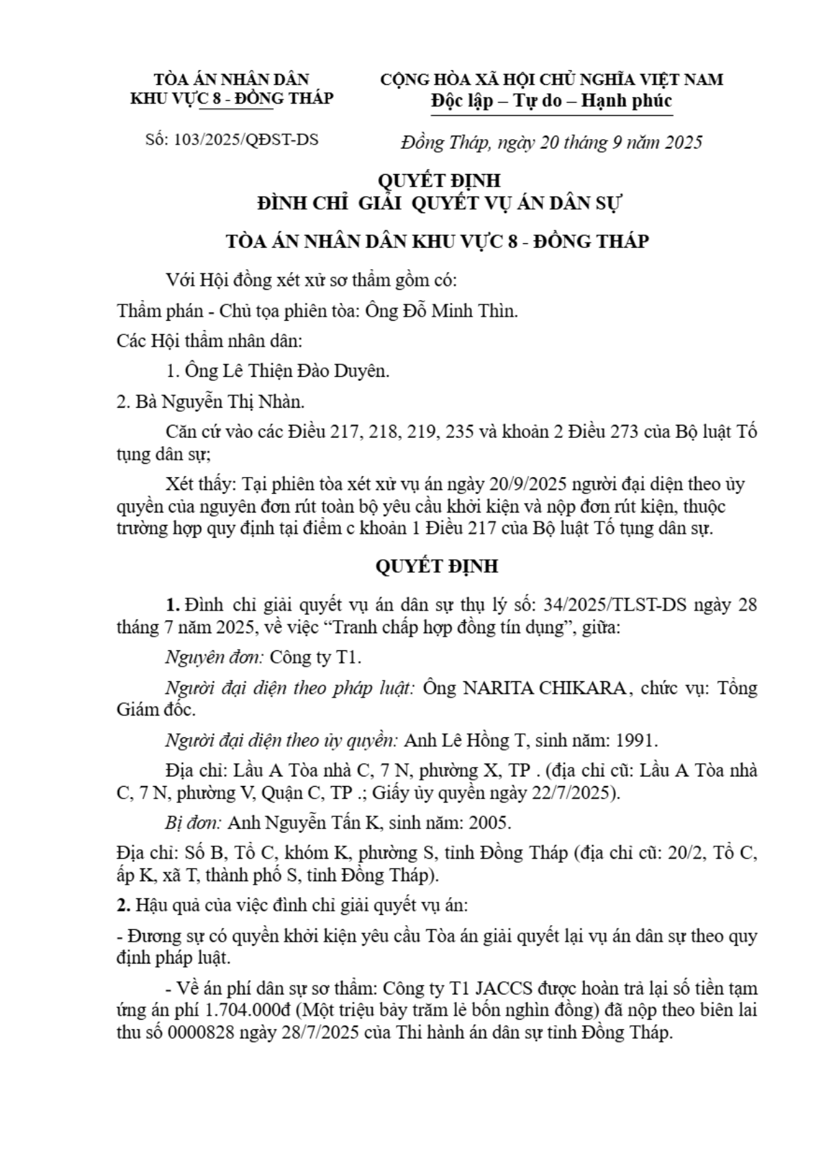 Quyết định số 103/2025/QĐST-DS ngày 20/09/2025 của Tòa án nhân dân khu vực 8 - Đồng Tháp, tỉnh Đồng Tháp về tranh chấp hợp đồng tín dụng