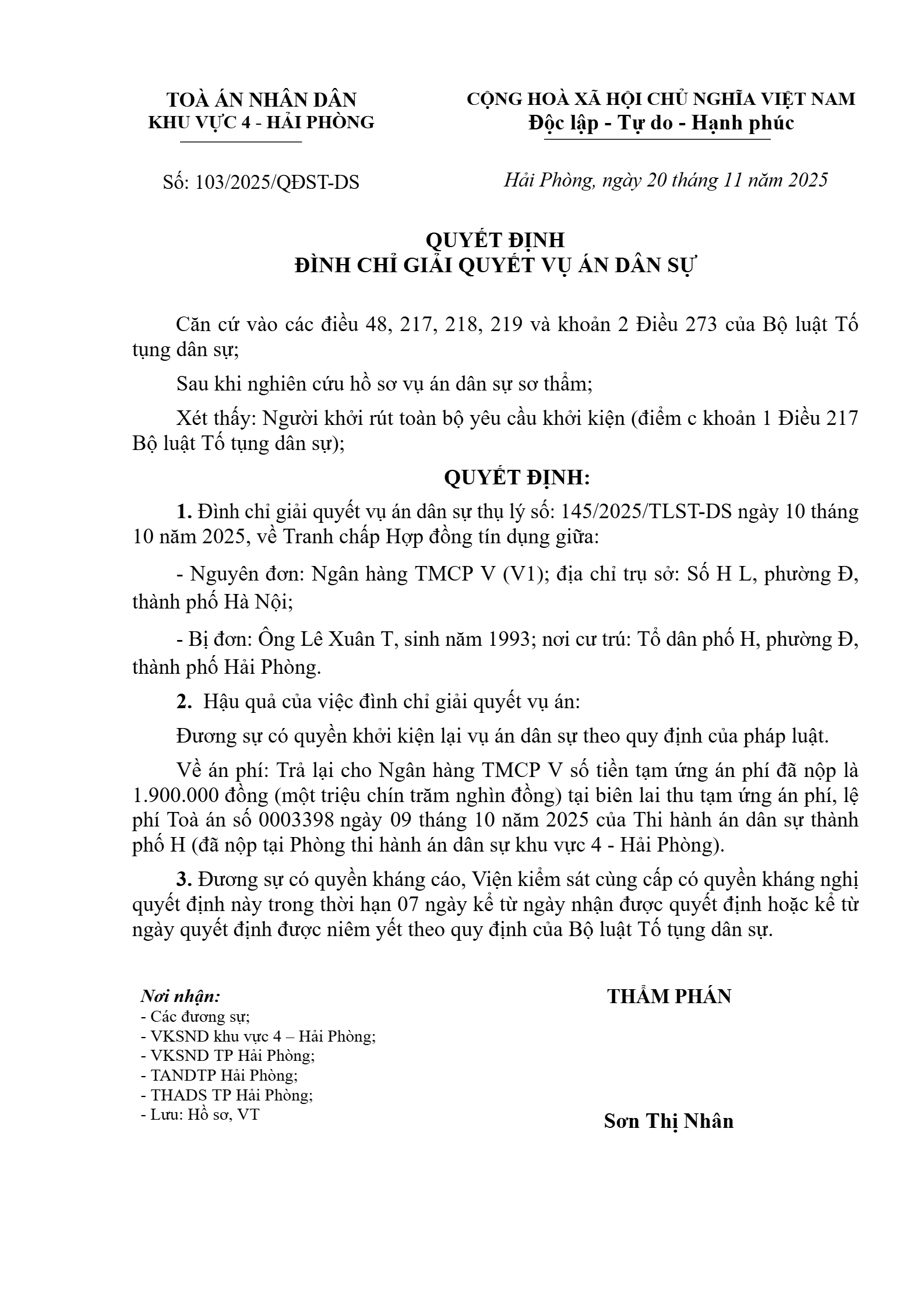 Quyết định số 103/2025/QĐST-DS ngày 20/11/2025 của Tòa án nhân dân khu vực 4 - Hải Phòng, TP. Hải Phòng về tranh chấp hợp đồng tín dụng