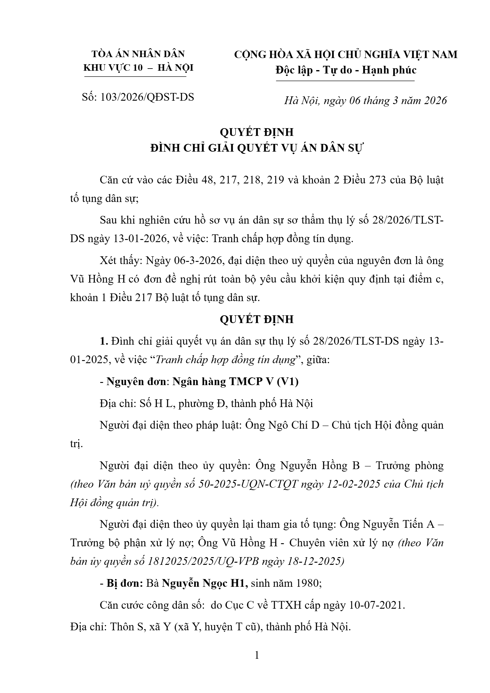 Quyết định số 103/2026/QĐST-DS ngày 06/03/2026 của Tòa án nhân dân khu vực 10 - Hà Nội, TP. Hà Nội về tranh chấp hợp đồng tín dụng