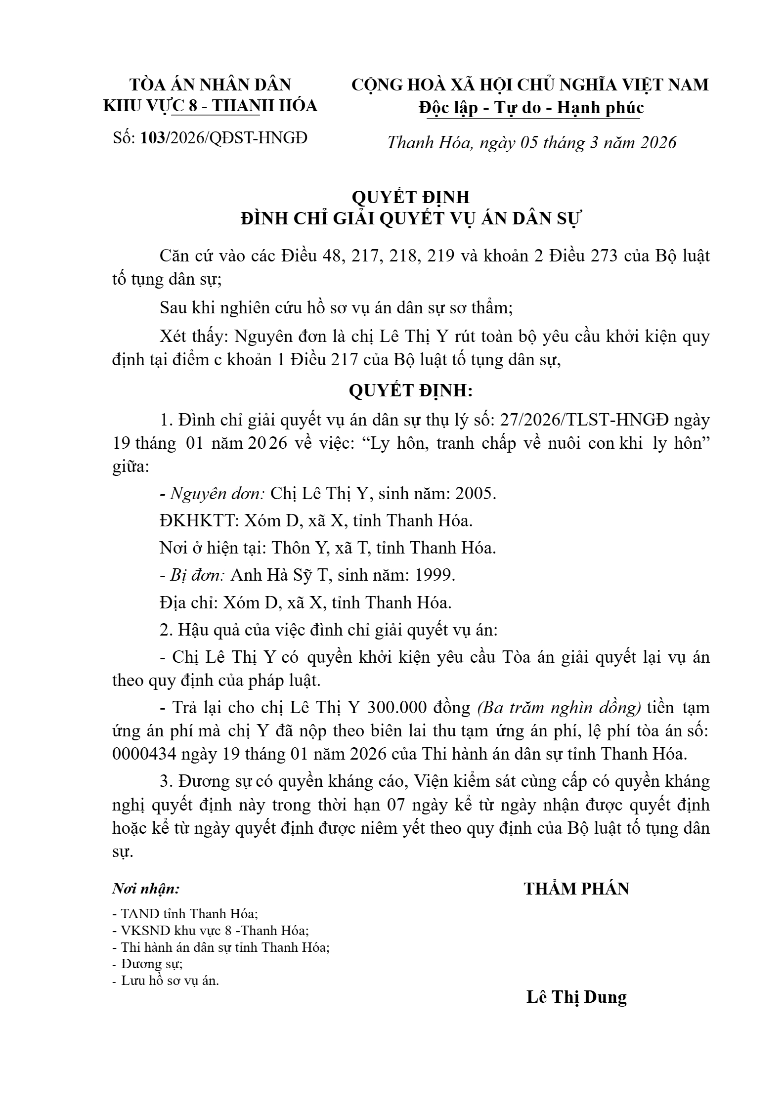 Quyết định số 103/2026/QĐST-HNGĐ ngày 05/03/2026 của Tòa án nhân dân khu vực 8 - Thanh Hóa, tỉnh Thanh Hóa về vụ án ly hôn về mâu thuẫn gia đình