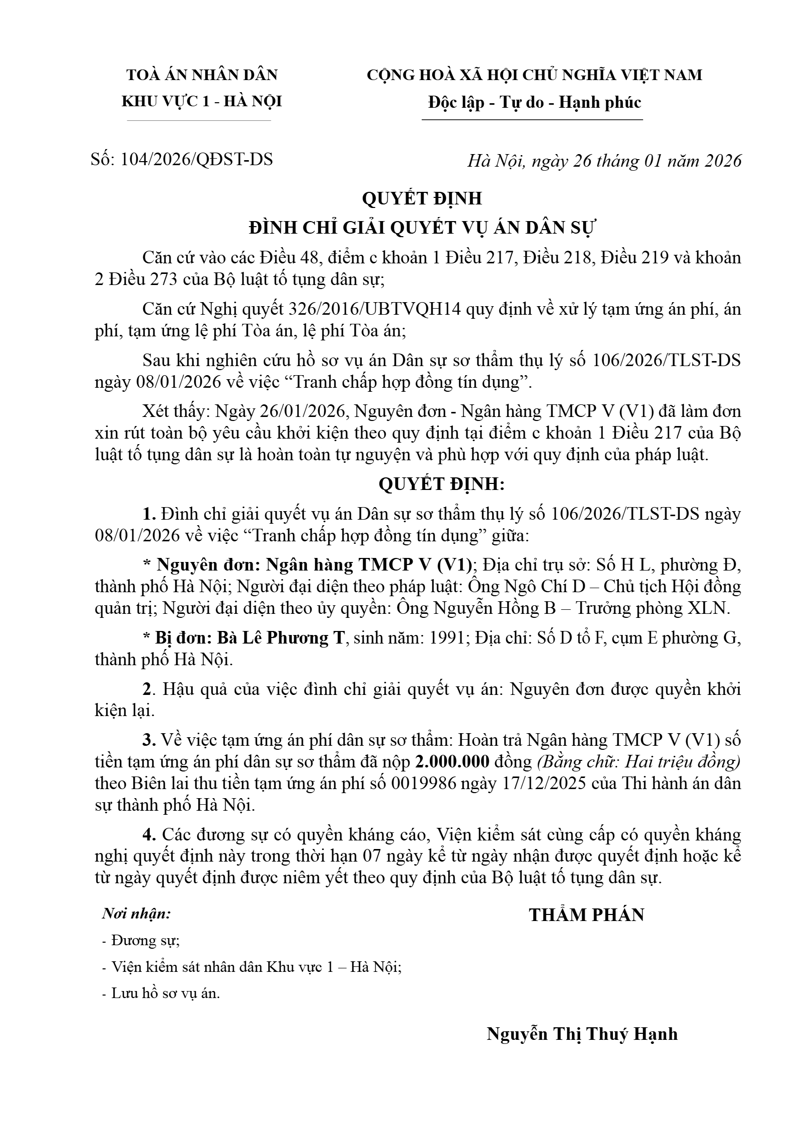 | Thông tin về vụ/việc: | Đình chỉ giải quyết vụ án Dân sự về việc “Tranh chấp hợp đồng tín dụng” giữa Ngân hàng TMCP V và Bà Lê Phương T |