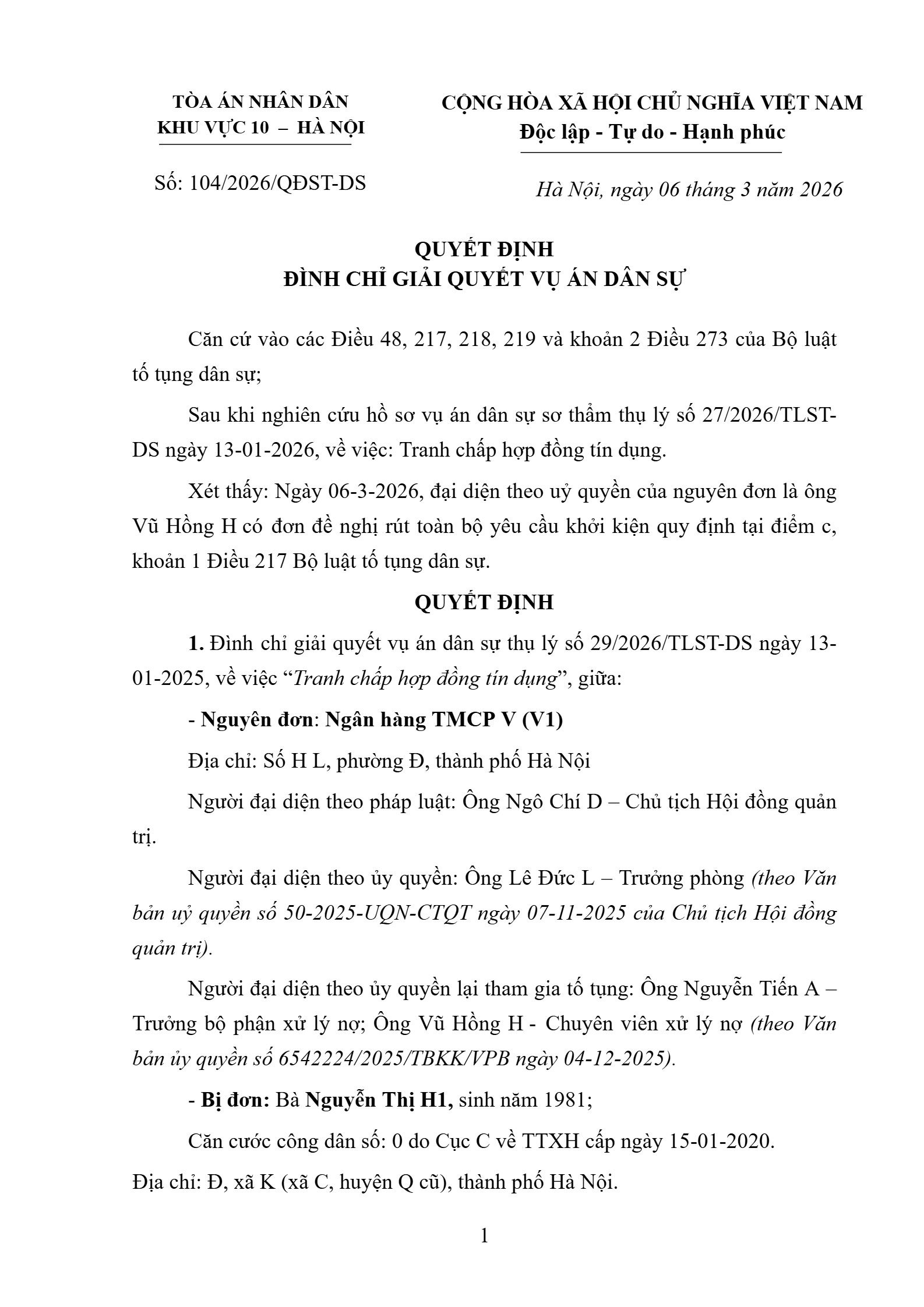 Quyết định số 104/2026/QĐST-DS ngày 06/03/2026 của Tòa án nhân dân khu vực 10 - Hà Nội, TP. Hà Nội về tranh chấp hợp đồng tín dụng
