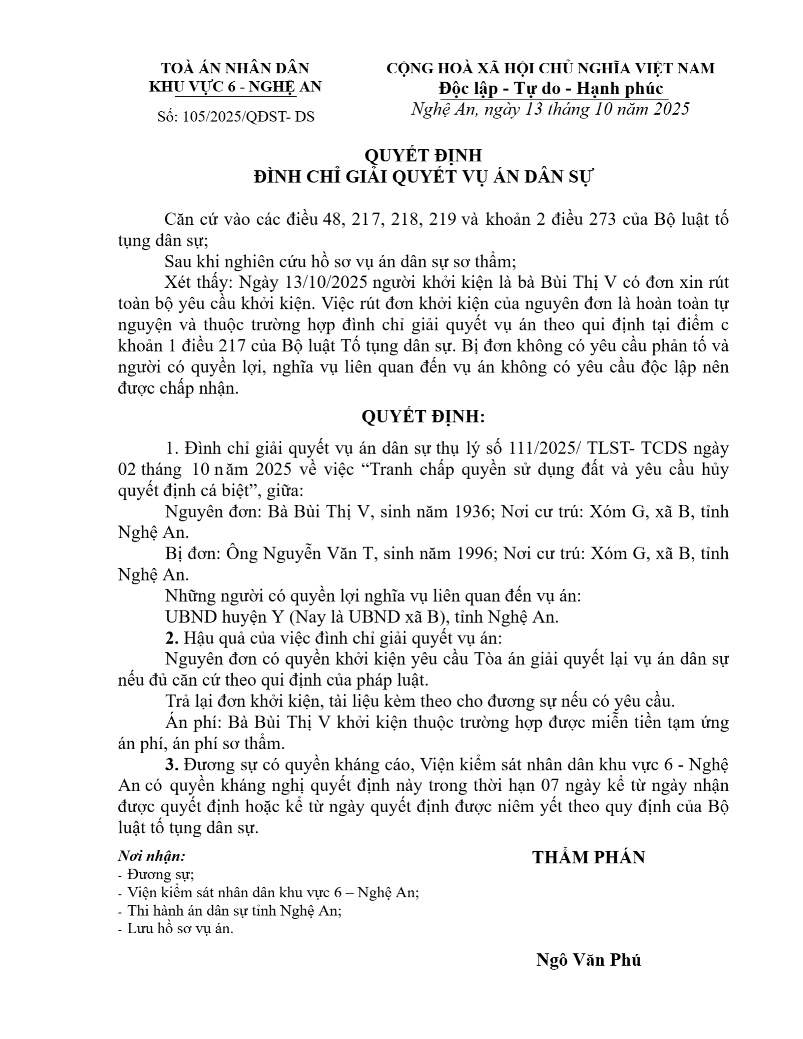 Quyết định số 105/2025/QĐST-DS ngày 13/10/2025 của Tòa án nhân dân khu vực 6 - Nghệ An, tỉnh Nghệ An về tranh chấp đất đai