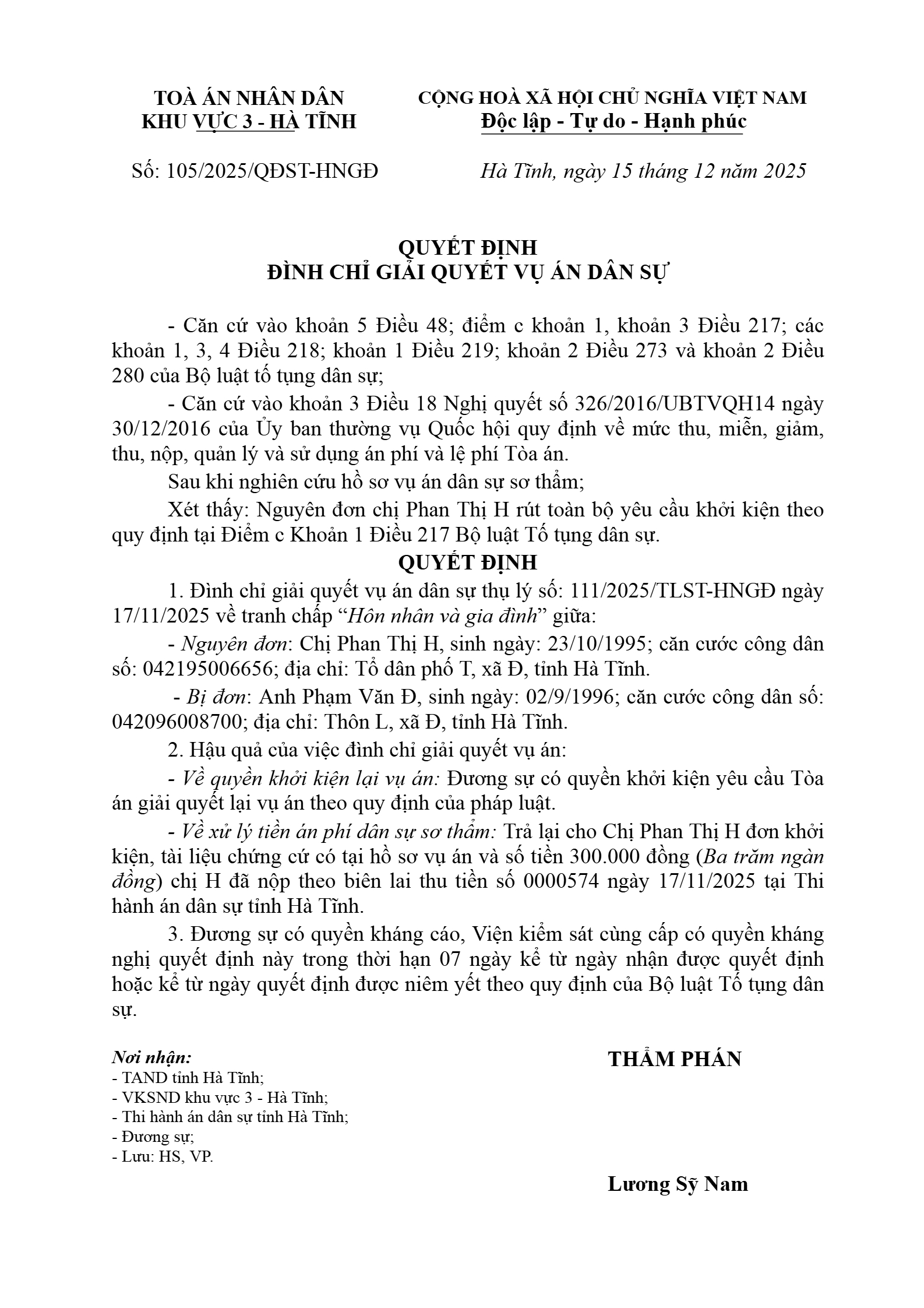 Quyết định số 105/2025/QĐST-HNGĐ ngày 15/12/2025 của Tòa án nhân dân khu vực 3 - Hà Tĩnh, tỉnh Hà Tĩnh về vụ án ly hôn về mâu thuẫn gia đình