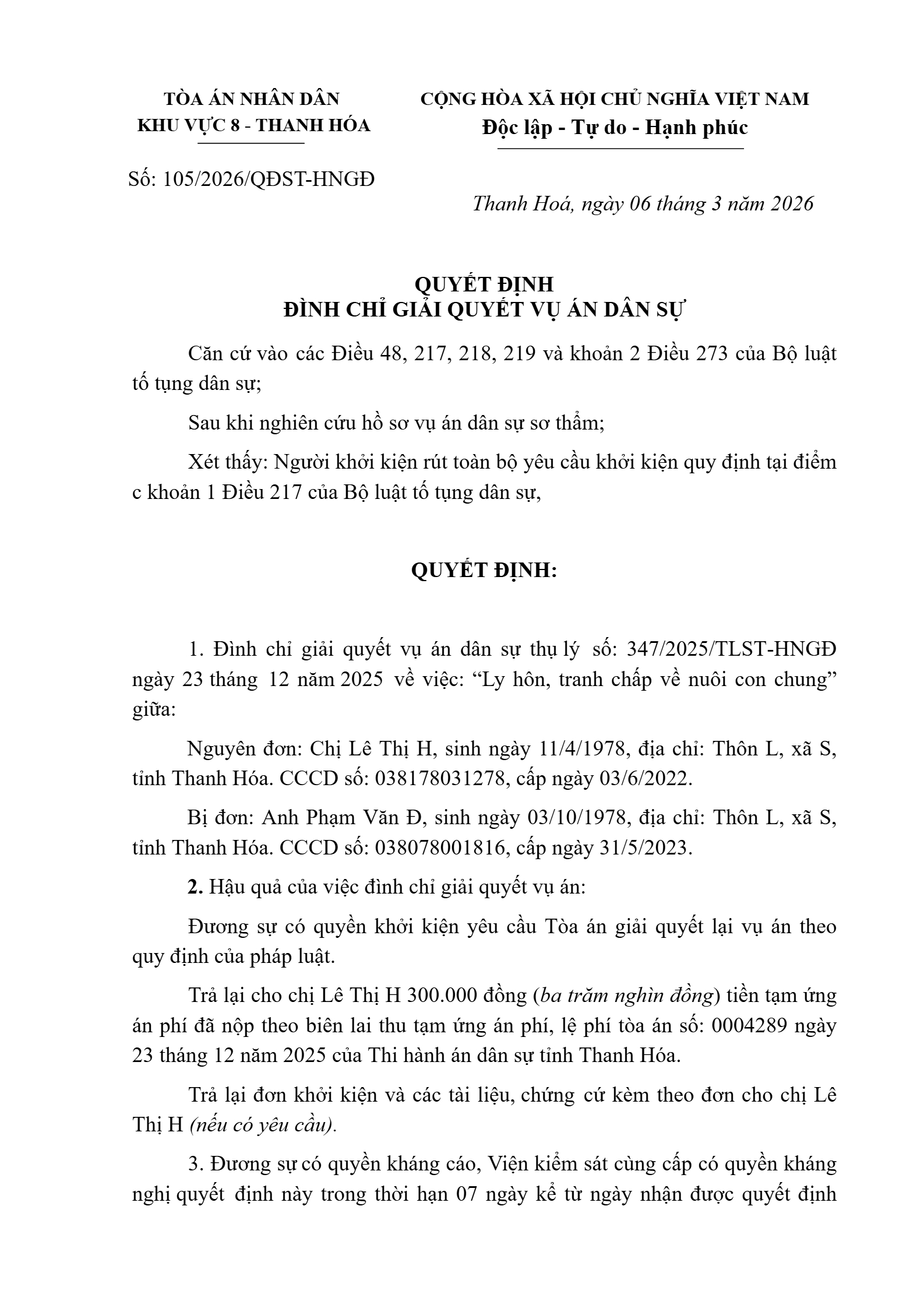 Quyết định số 105/2026/QĐST-HNGĐ ngày 06/03/2026 của Tòa án nhân dân khu vực 8 - Thanh Hóa, tỉnh Thanh Hóa về vụ án ly hôn về mâu thuẫn gia đình