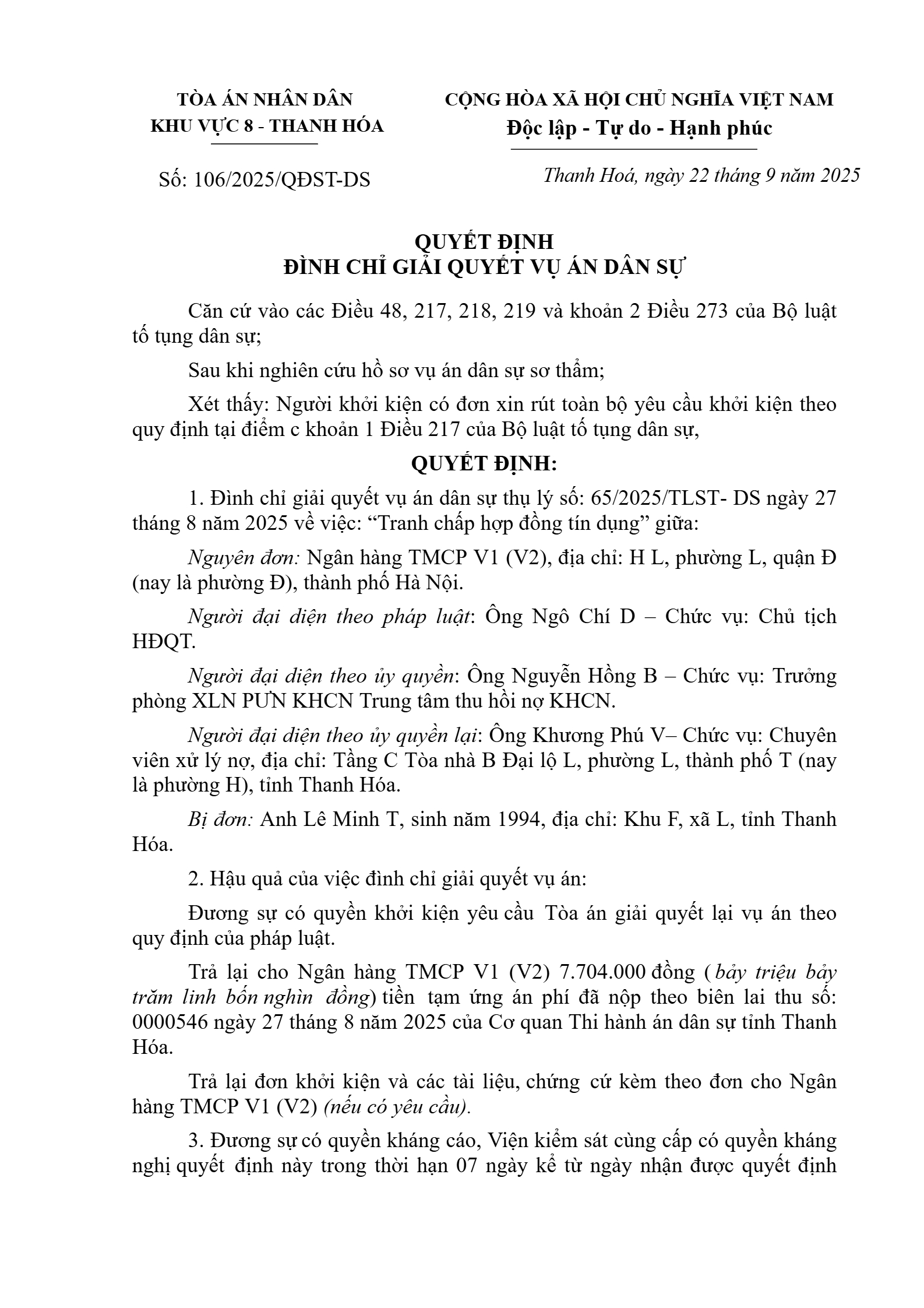 Quyết định số 106/2025/QĐST-DS ngày 22/09/2025 của Tòa án nhân dân khu vực 8 - Thanh Hóa, tỉnh Thanh Hóa về tranh chấp hợp đồng tín dụng