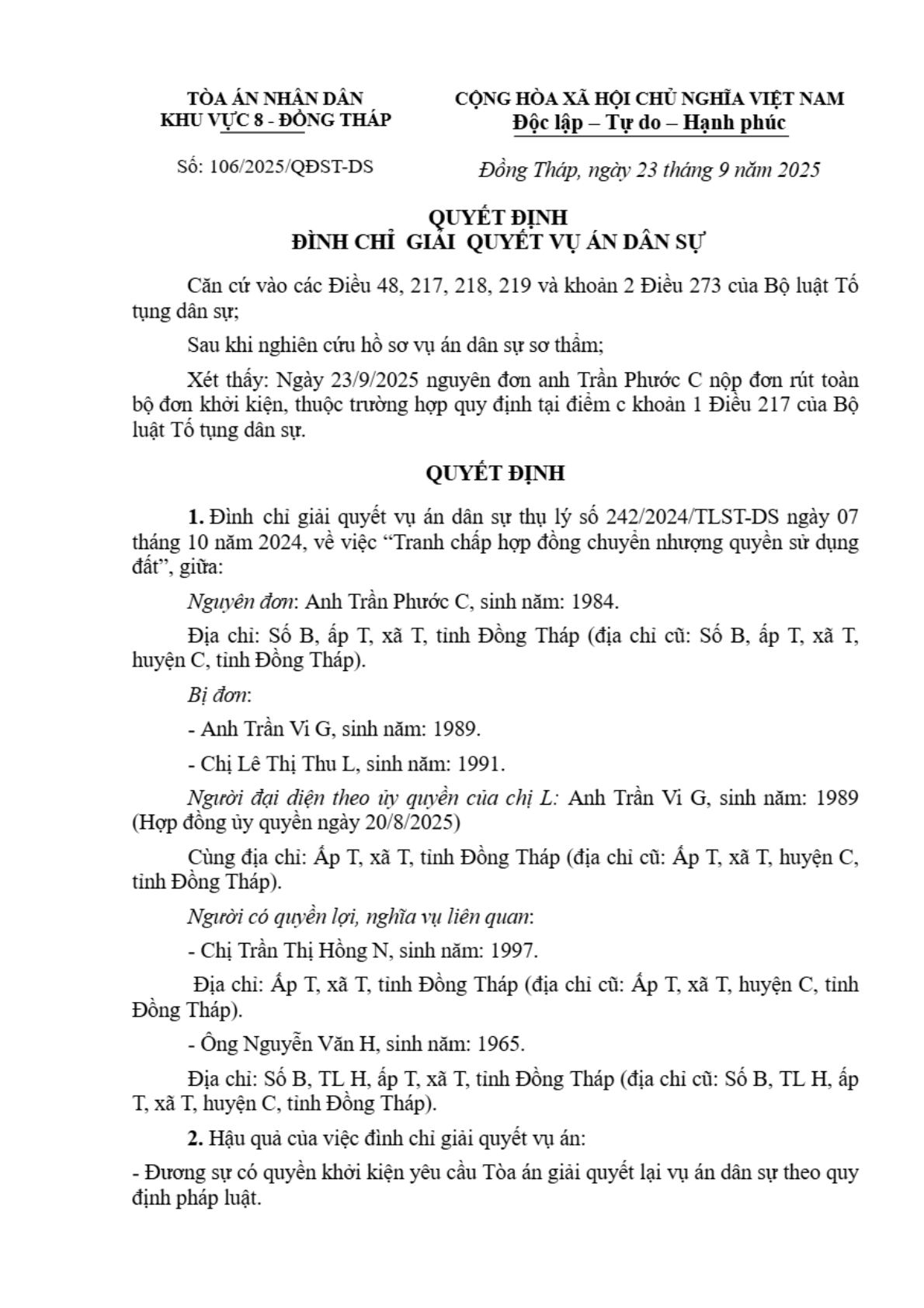 Quyết định số 106/2025/QĐST-DS ngày 23/09/2025 của Tòa án nhân dân khu vực 8 - Đồng Tháp, tỉnh Đồng Tháp về tranh chấp hợp đồng chuyển nhượng quyền sử dụng đất