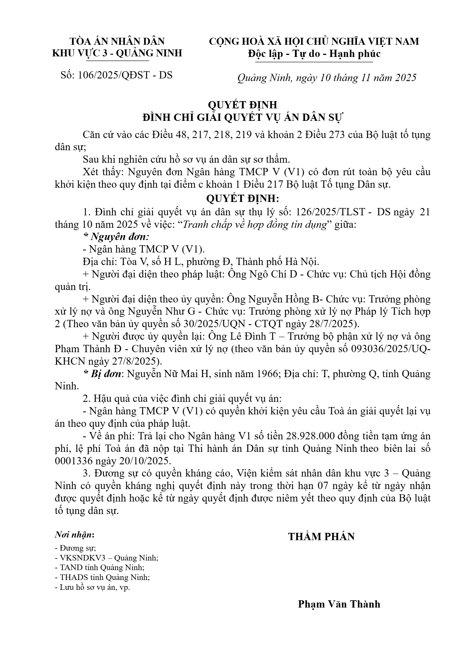 Quyết định số 106/2025/QĐST-DS ngày 10/11/2025 của Tòa án nhân dân khu vực 3 - Quảng Ninh, tỉnh Quảng Ninh về tranh chấp hợp đồng tín dụng