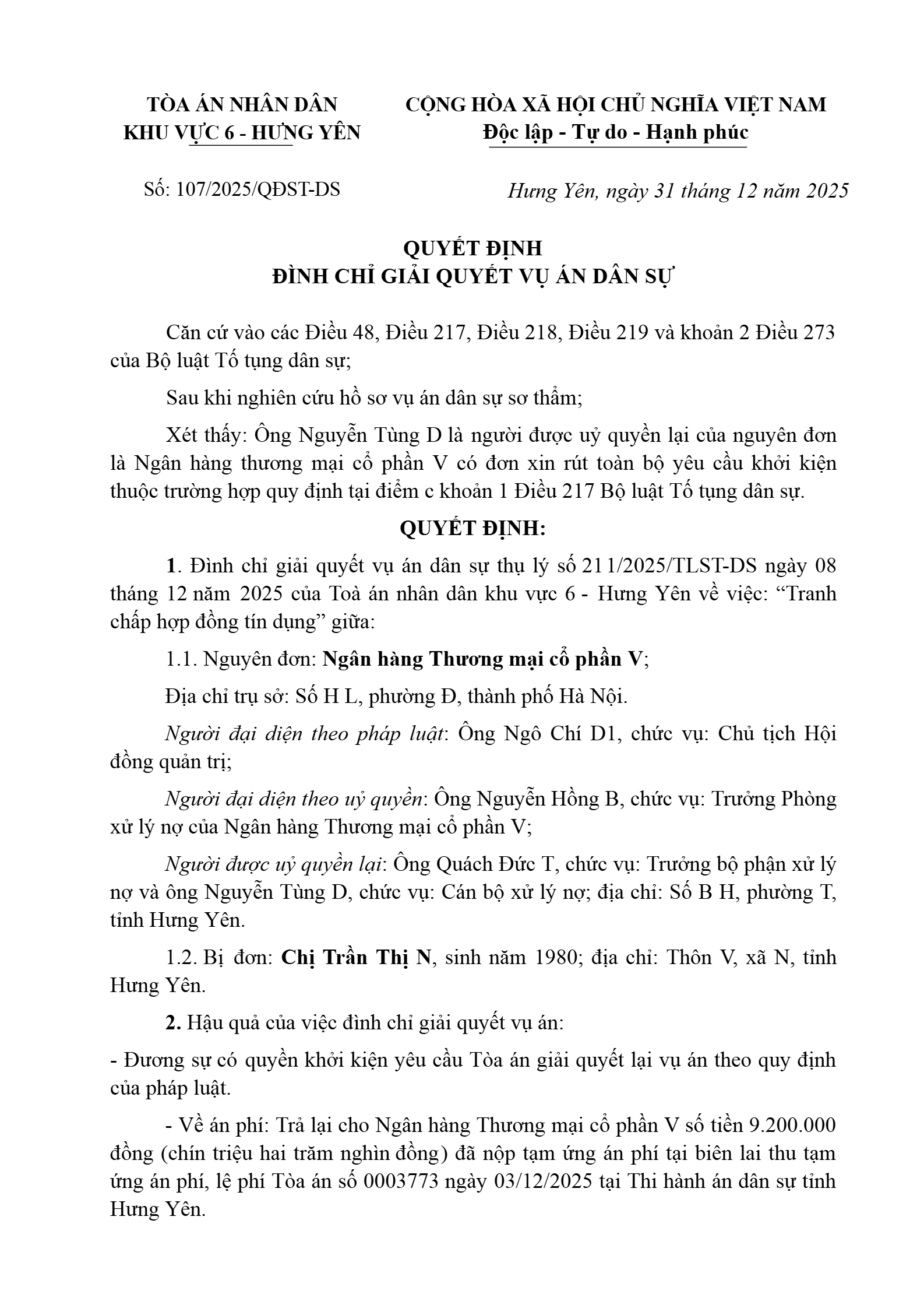 Quyết định số 107/2025/QĐST-DS ngày 31/12/2025 của Tòa án nhân dân khu vực 6 - Hưng Yên, tỉnh Hưng Yên về tranh chấp hợp đồng tín dụng