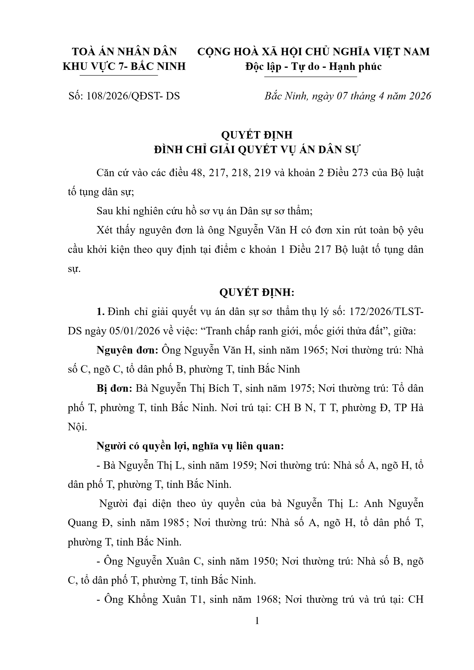 Quyết định số 108/2026/QĐST-DS ngày 07/04/2026 của Tòa án nhân dân khu vực 7 - Bắc Ninh, tỉnh Bắc Ninh về tranh chấp quyền sử dụng đất