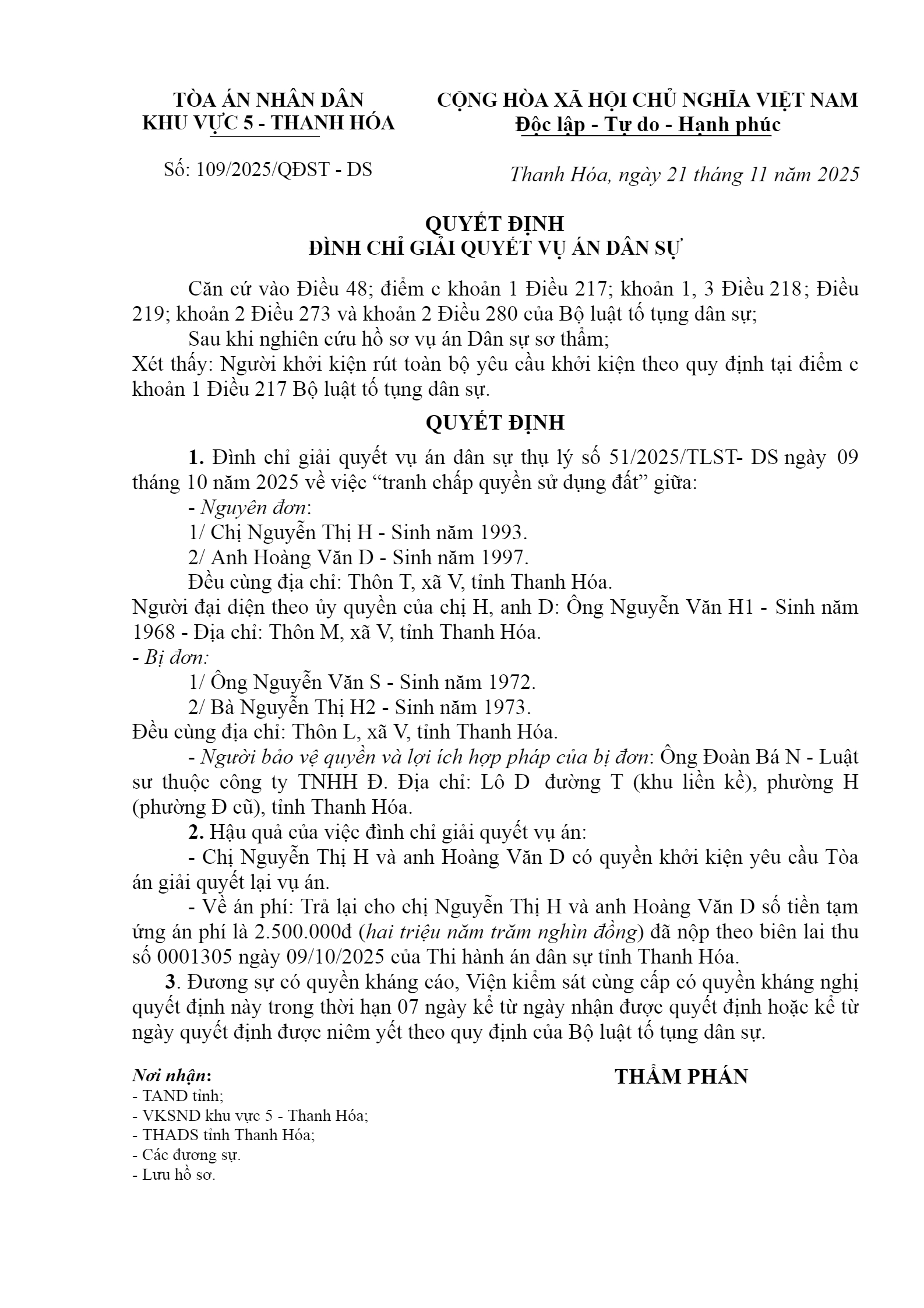 Quyết định số 109/2025/QĐST-DS ngày 21/11/2025 của Tòa án nhân dân khu vực 5 - Thanh Hóa, tỉnh Thanh Hóa về tranh chấp quyền sử dụng đất