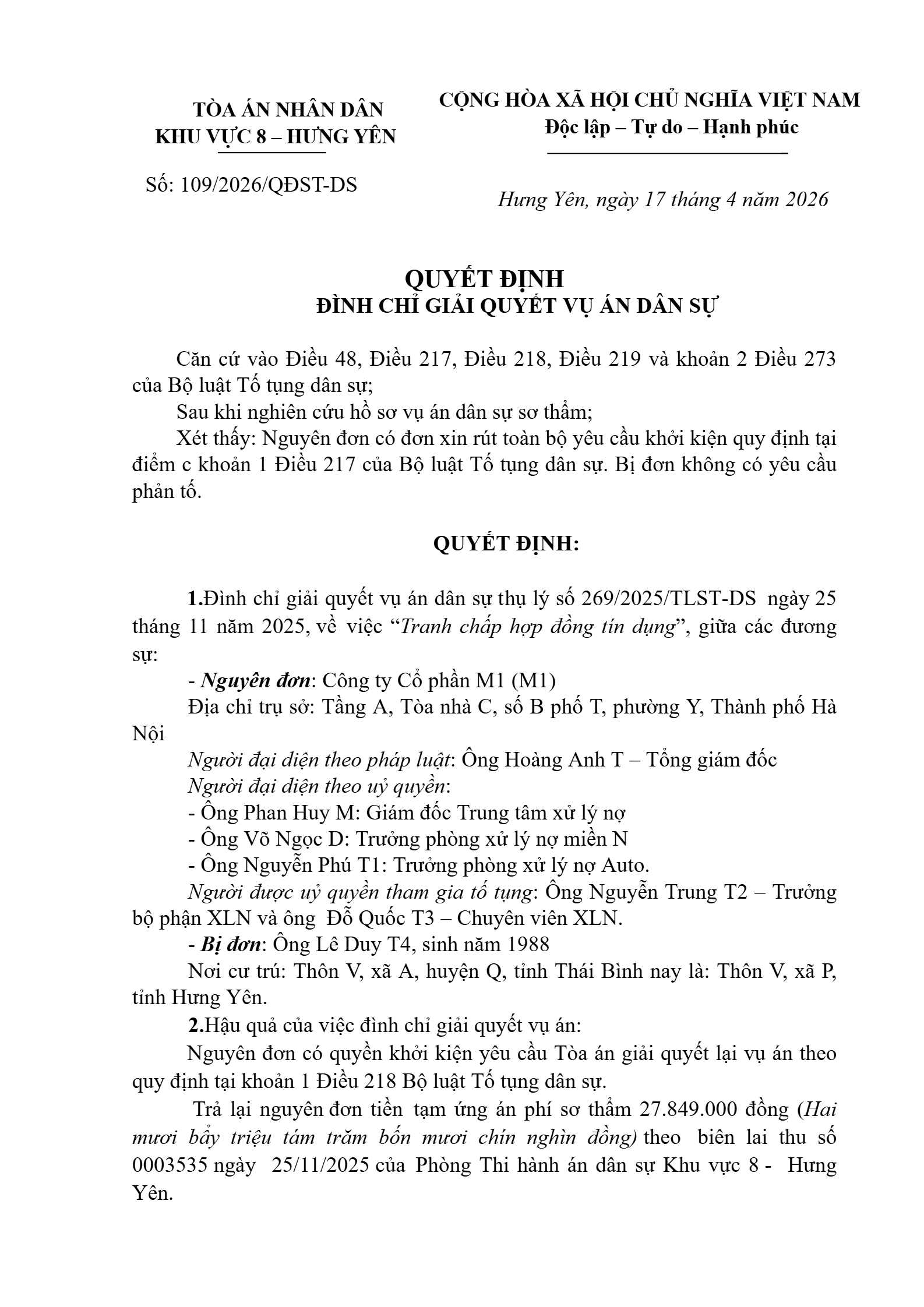 Quyết định số 109/2026/QĐST-DS ngày 17/04/2026 của Tòa án nhân dân khu vực 8 - Hưng Yên, tỉnh Hưng Yên về tranh chấp hợp đồng tín dụng