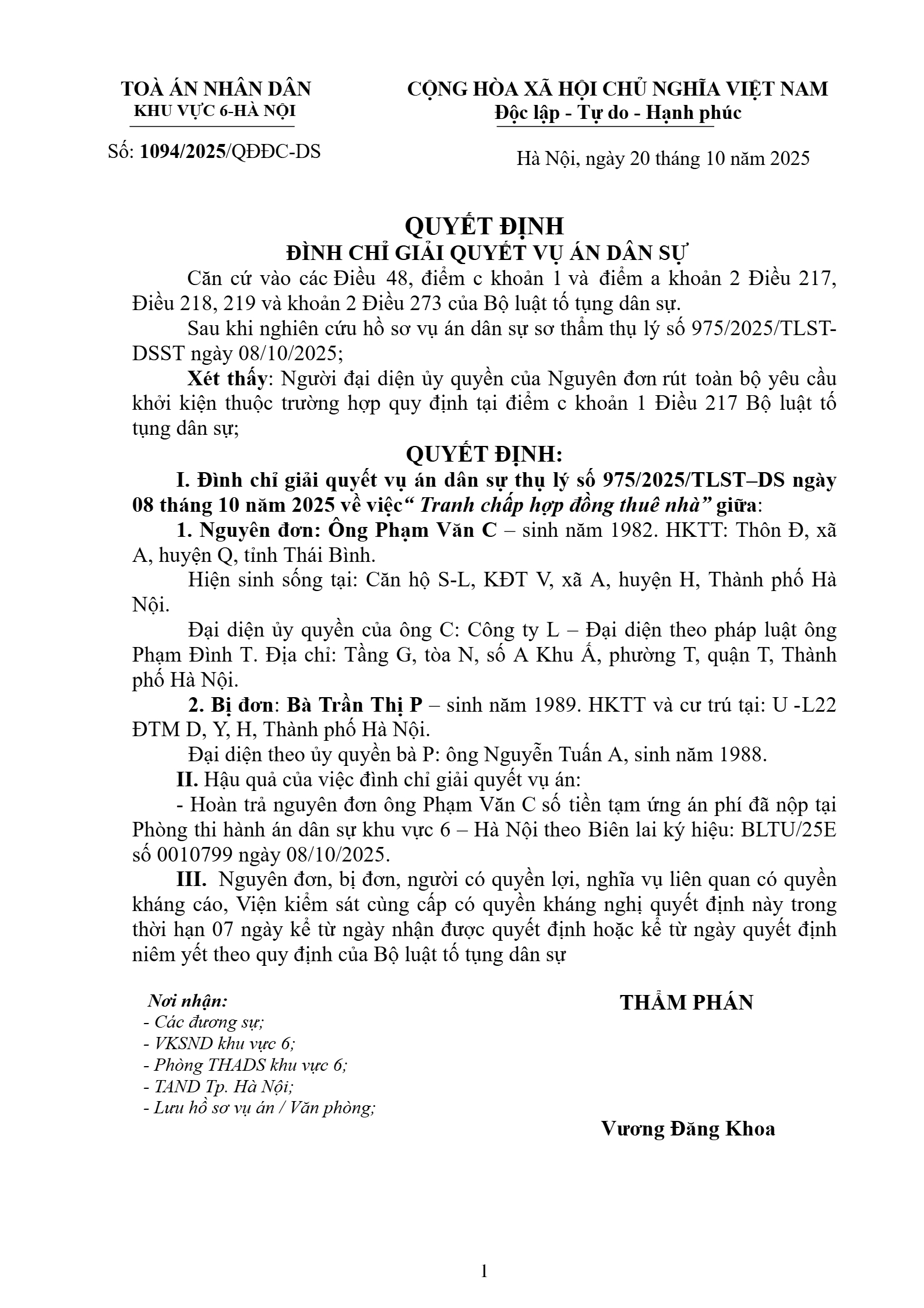 Quyết định số 1094/2025/QĐST-DS ngày 20/10/2025 của Tòa án nhân dân khu vực 6 - Hà Nội, TP. Hà Nội về tranh chấp hợp đồng thuê nhà