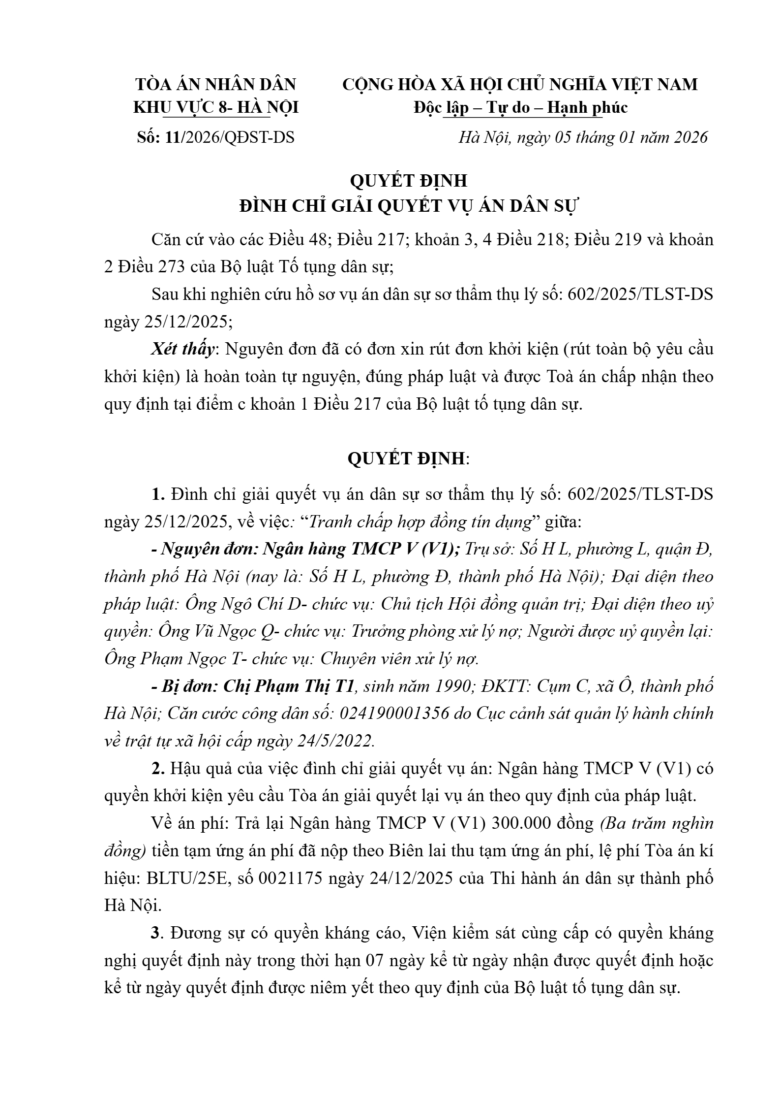 Quyết định số 11/2026/QĐST-DS ngày 05/01/2026 của Tòa án nhân dân khu vực 8 - Hà Nội, TP. Hà Nội về tranh chấp hợp đồng tín dụng