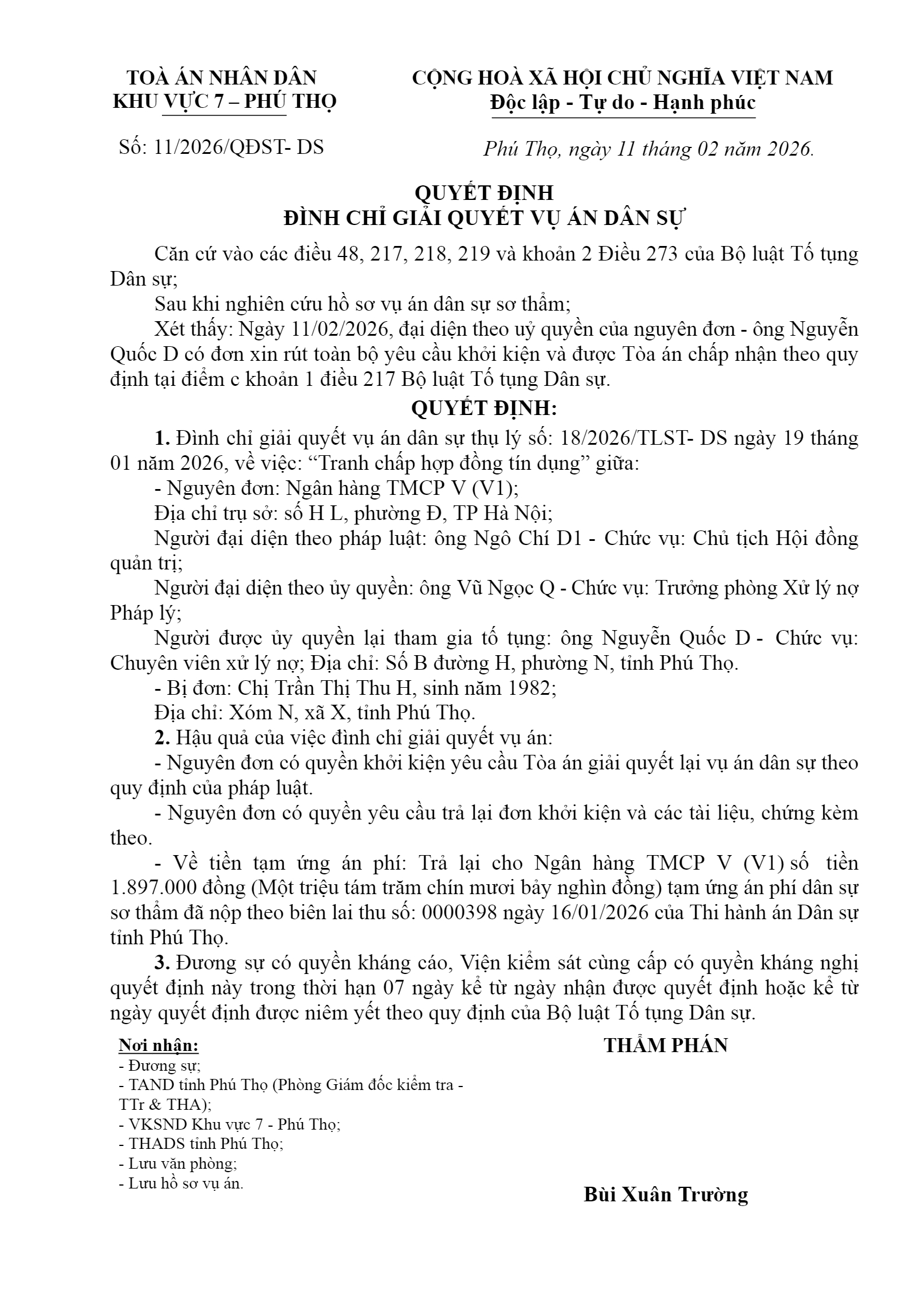 Quyết định số 11/2026/QĐST-DS ngày 11/02/2026 của Tòa án nhân dân khu vực 7 - Phú Thọ, tỉnh Phú Thọ về tranh chấp hợp đồng tín dụng