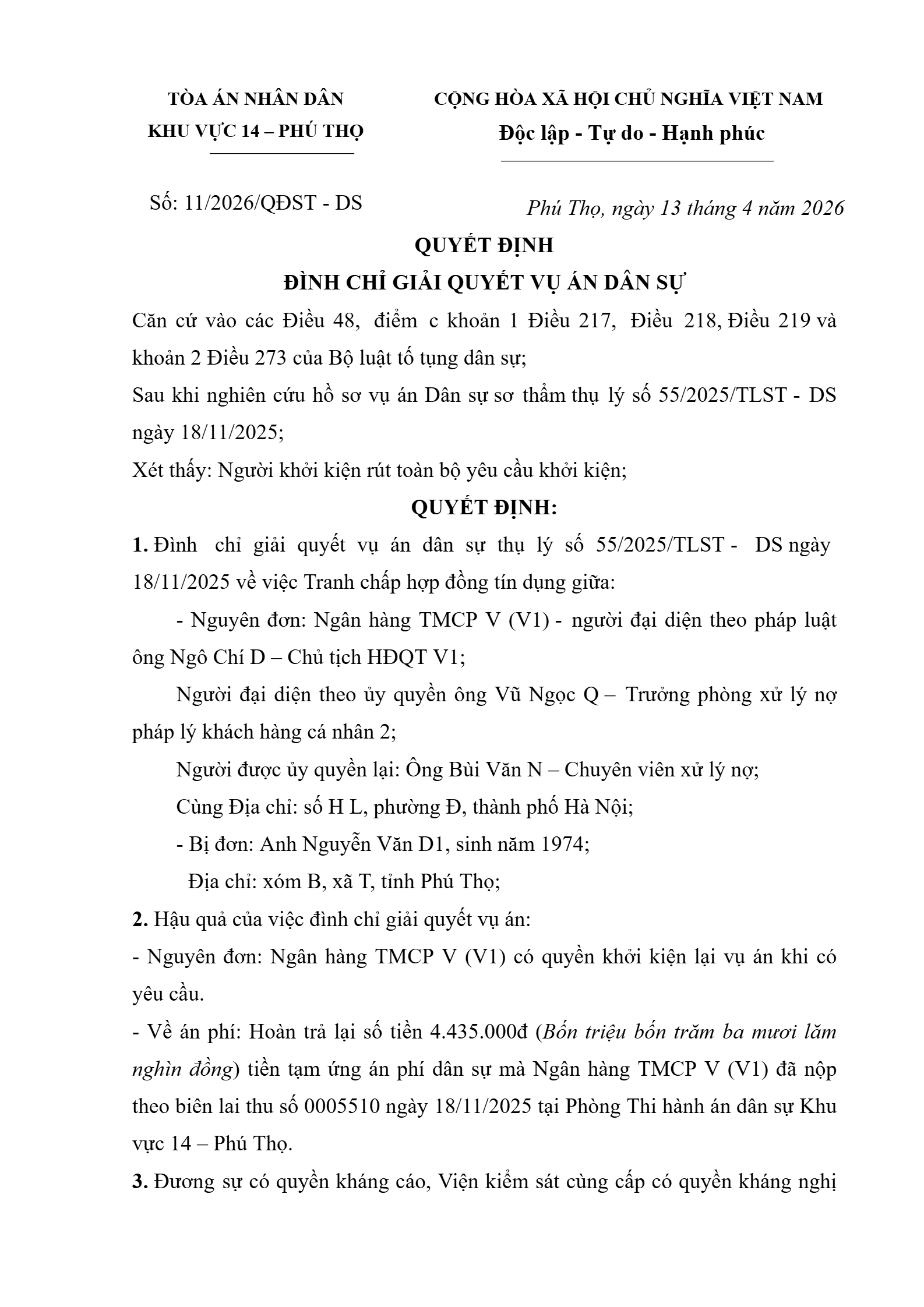 Quyết định số 11/2026/QĐST-DS ngày 13/04/2026 của Tòa án nhân dân khu vực 14 - Phú Thọ, tỉnh Phú Thọ về tranh chấp hợp đồng tín dụng