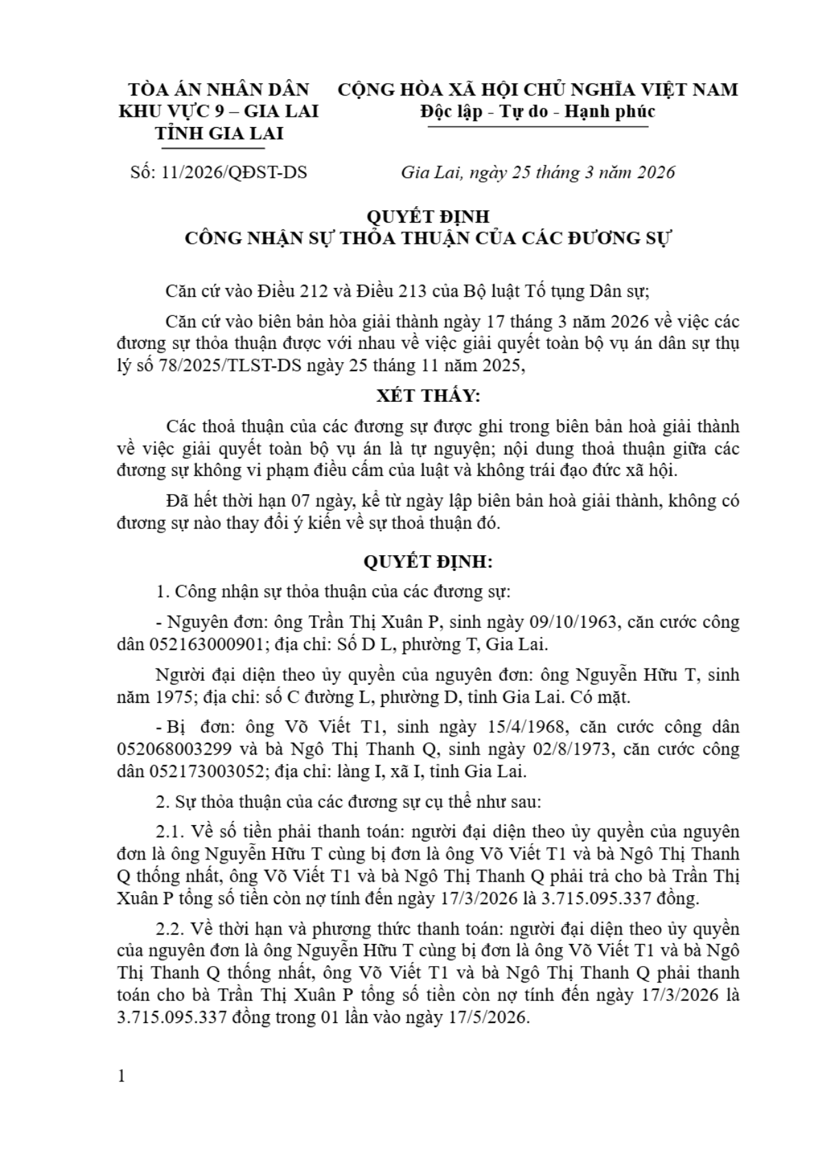 Quyết định số 11/2026/QĐST-DS ngày 25/03/2026 của Tòa án nhân dân khu vực 9 - Gia Lai, tỉnh Gia Lai về tranh chấp hợp đồng trao đổi tài sản
