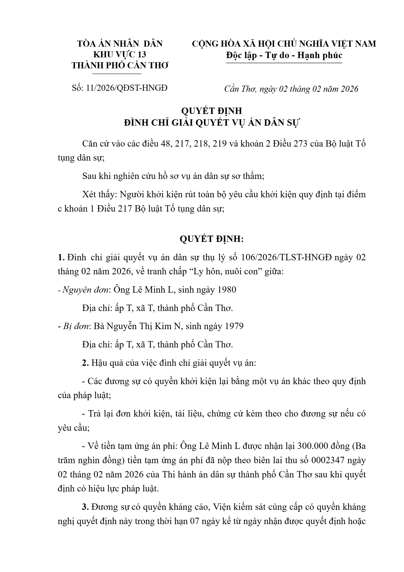 | Tòa án xét xử: | Tòa án nhân dân khu vực 13 - Cần Thơ, TP. Cần Thơ |