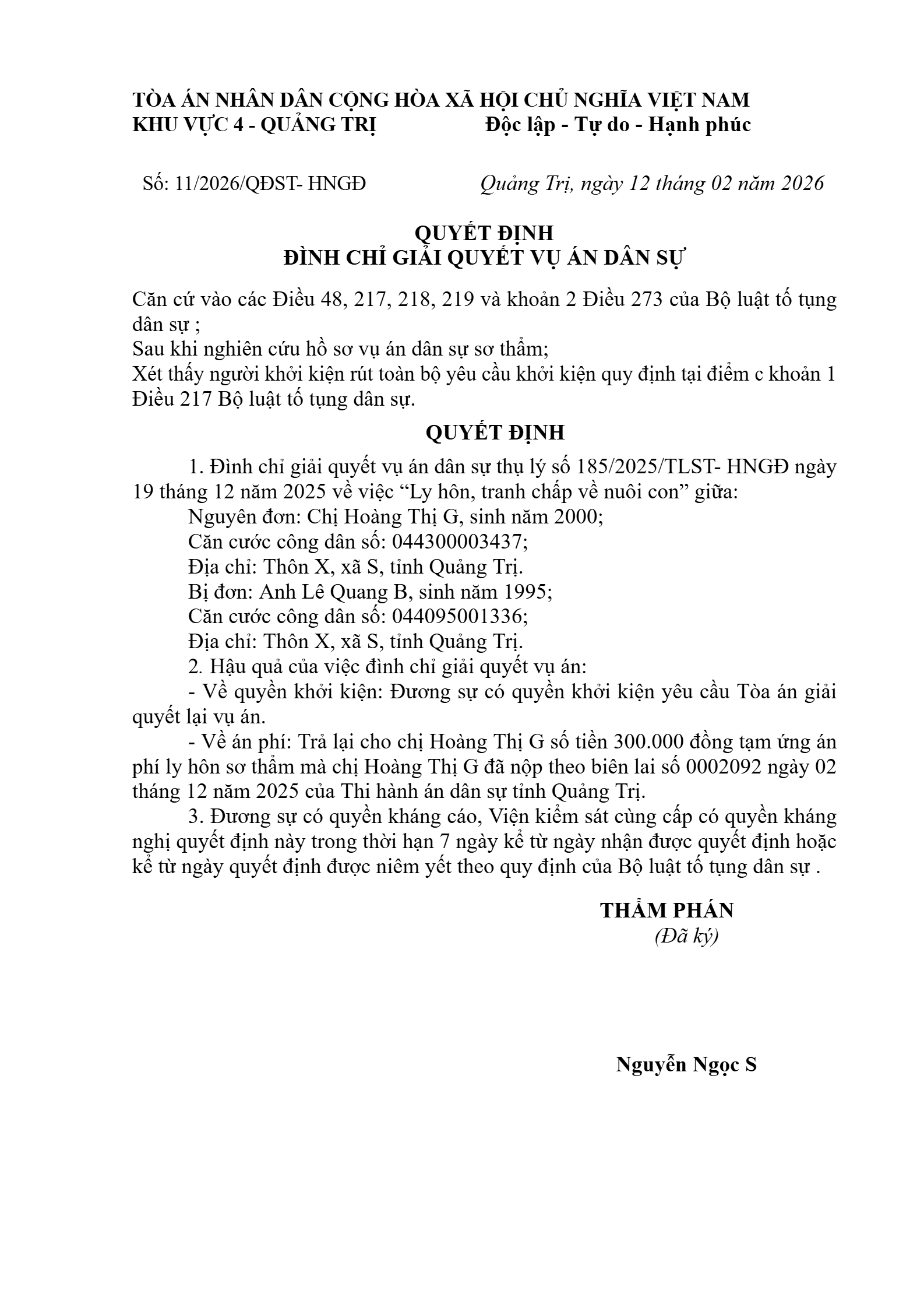 Quyết định số 11/2026/QĐST-HNGĐ ngày 12/02/2026 của Tòa án nhân dân khu vực 4 - Quảng Trị, tỉnh Quảng Trị về vụ án ly hôn về mâu thuẫn gia đình