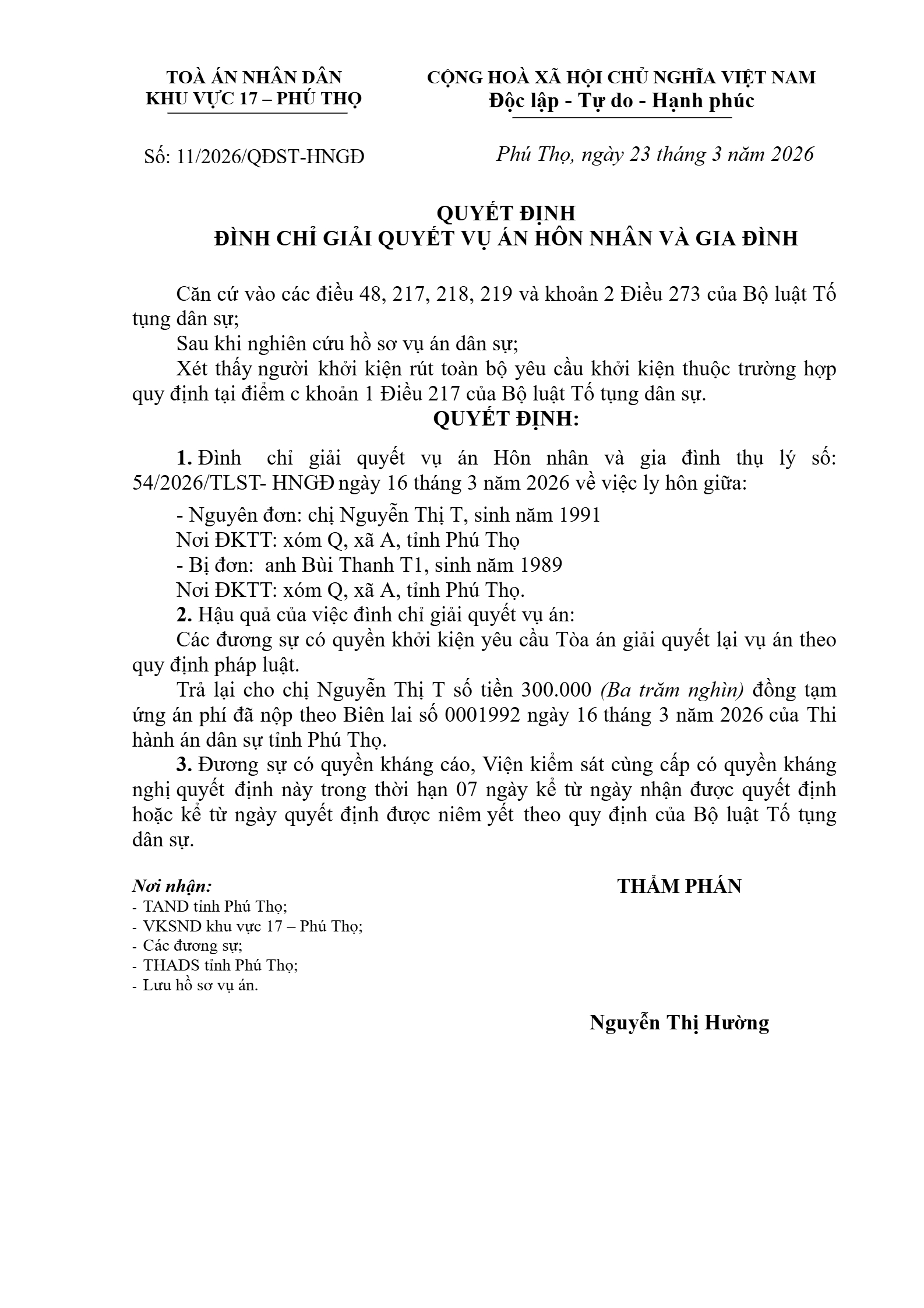 Quyết định số 11/2026/QĐST-HNGĐ ngày 23/03/2026 của Tòa án nhân dân khu vực 17 - Phú Thọ, tỉnh Phú Thọ về vụ án ly hôn về mâu thuẫn gia đình