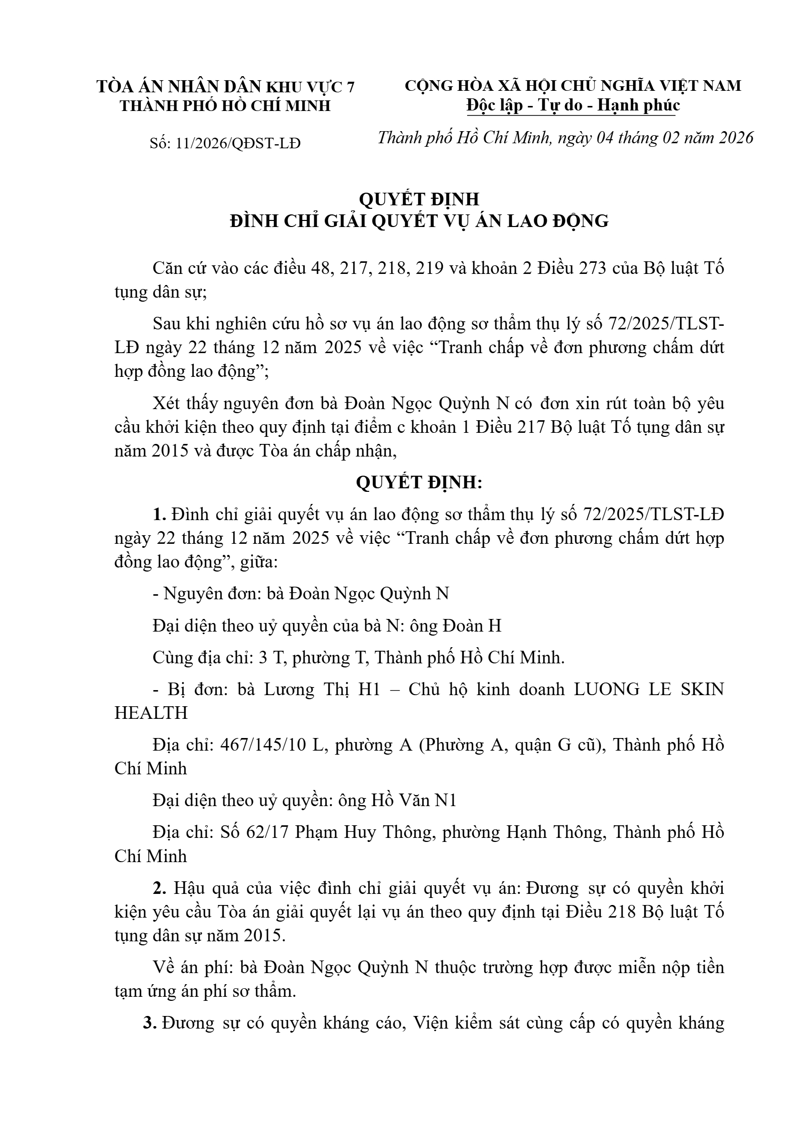 | Tên Quyết định: | Quyết định số 11/2026/QĐST-LĐ ngày 04/02/2026 của Tòa án nhân dân khu vực 7 - Hồ Chí Minh, TP. Hồ Chí Minh về tranh chấp về xử lý kỷ luật, sa thải, đơn phương chấm dứt hợp đồng lao động |