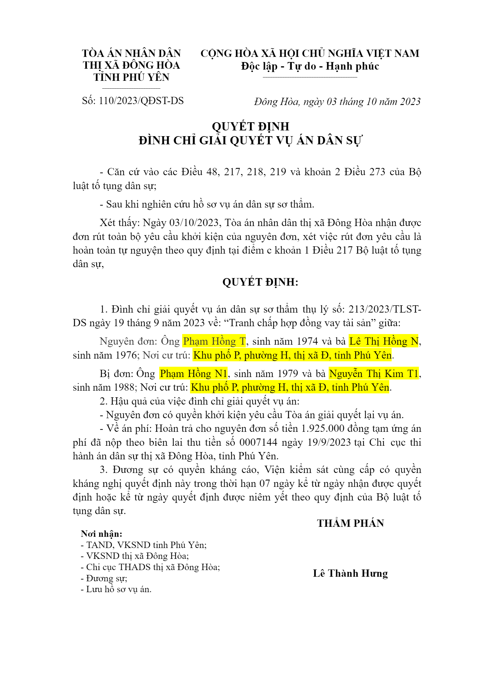 Quyết định số 110/2023/QĐST-DS ngày 03/10/2024 của TAND huyện Đông Hòa, tỉnh Phú Yên về tranh chấp hợp đồng vay tài sản
