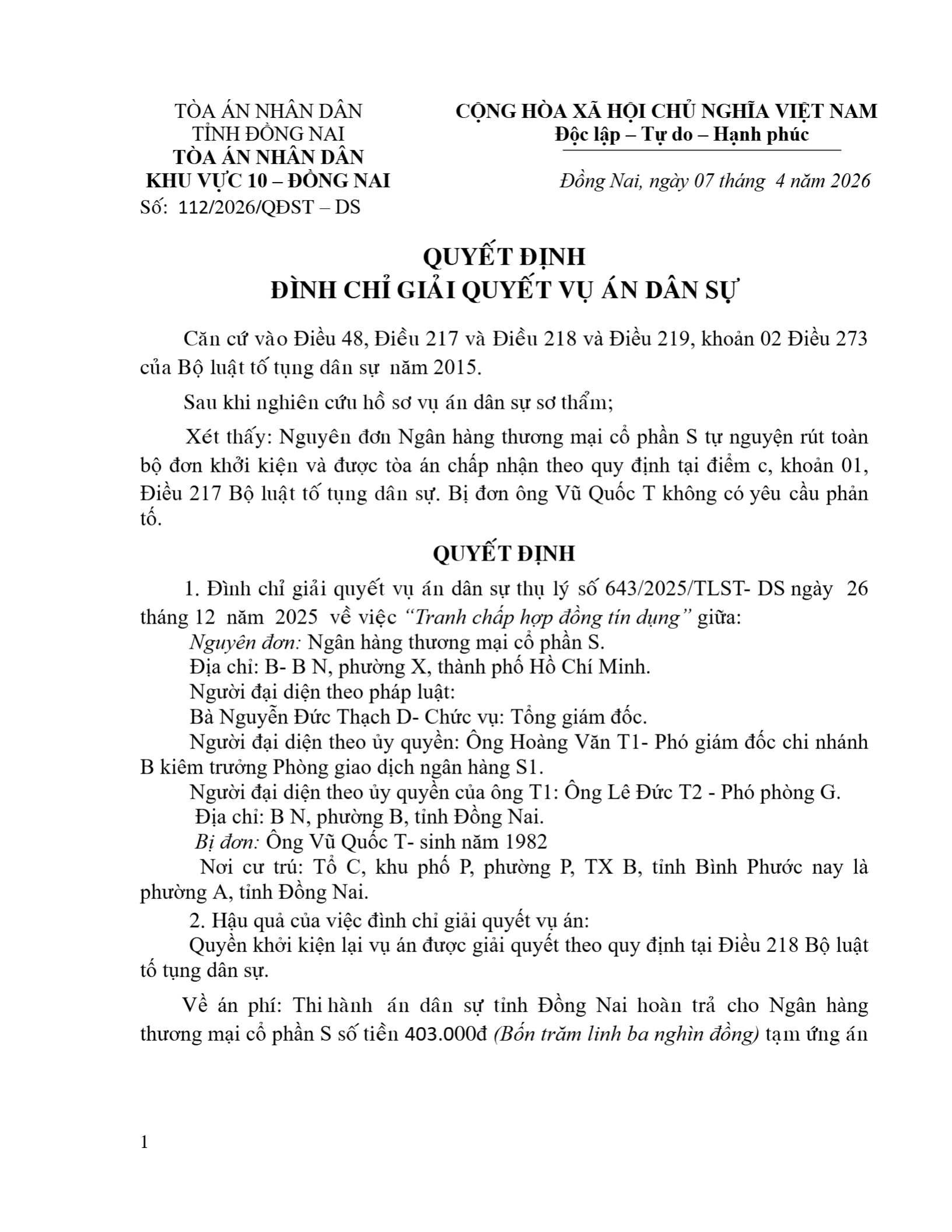 Quyết định số 112/2026/QĐST-DS ngày 07/04/2026 của Tòa án nhân dân khu vực 10 - Đồng Nai, tỉnh Đồng Nai về tranh chấp hợp đồng tín dụng