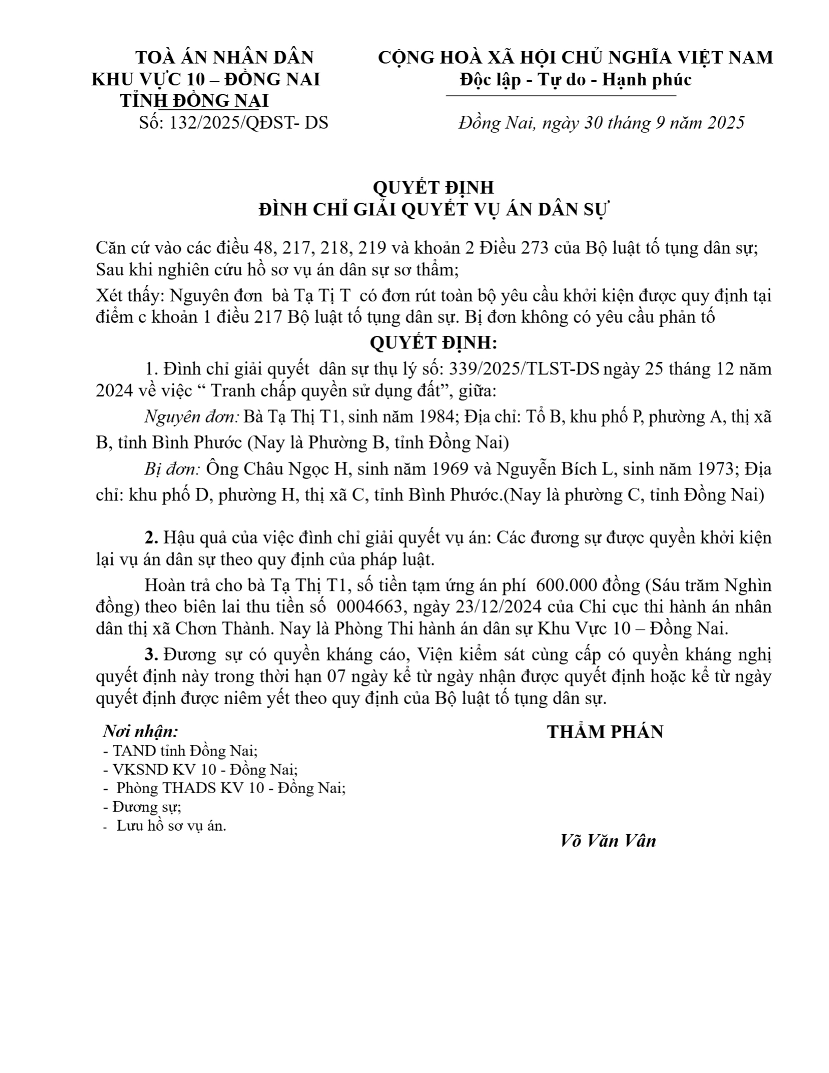 Quyết định số 113/2025/QĐST-DS ngày 30/09/2025 của Tòa án nhân dân khu vực 10 - Đồng Nai, tỉnh Đồng Nai về tranh chấp đất đai