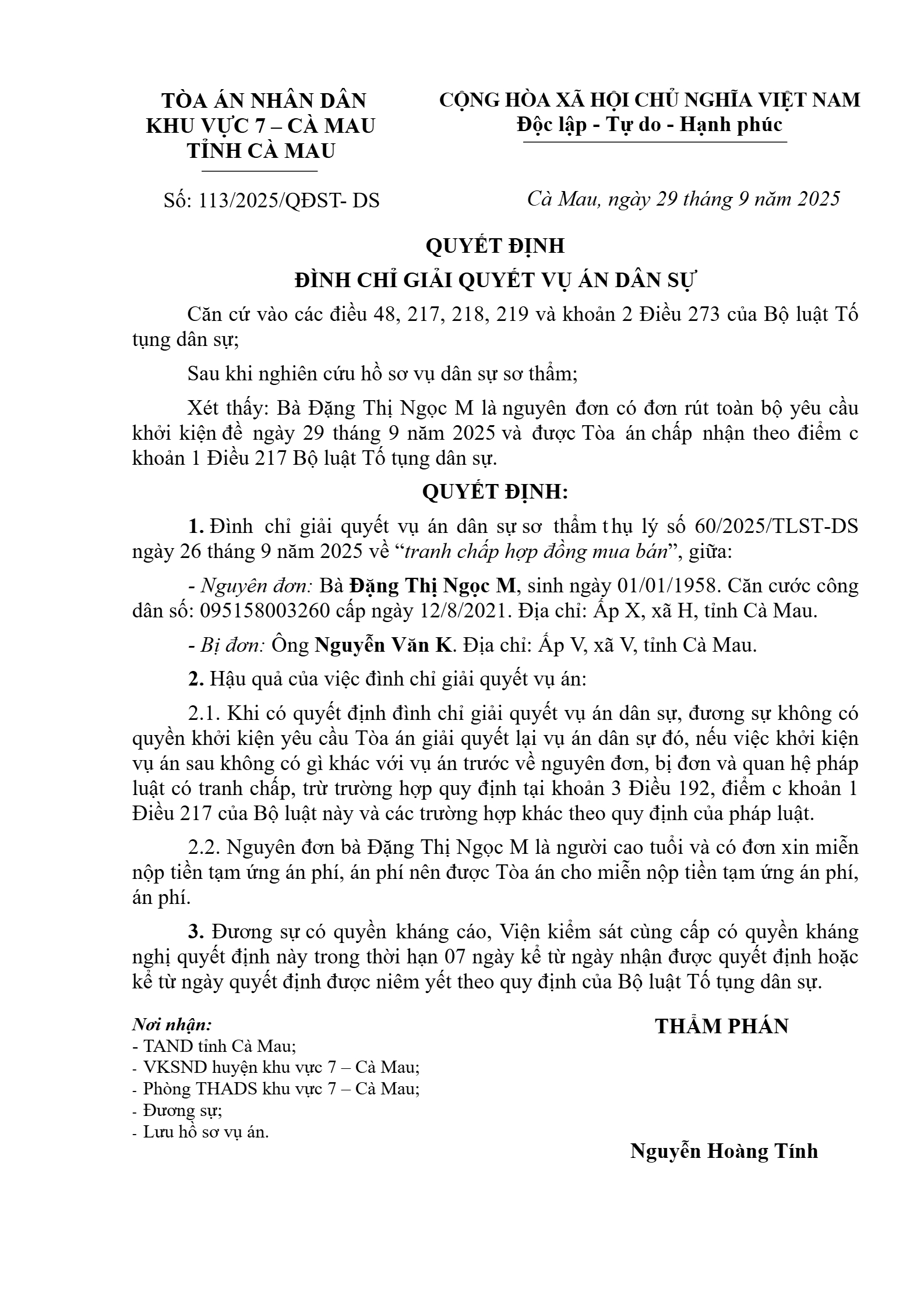 Quyết định số 113/2025/QĐST-DS