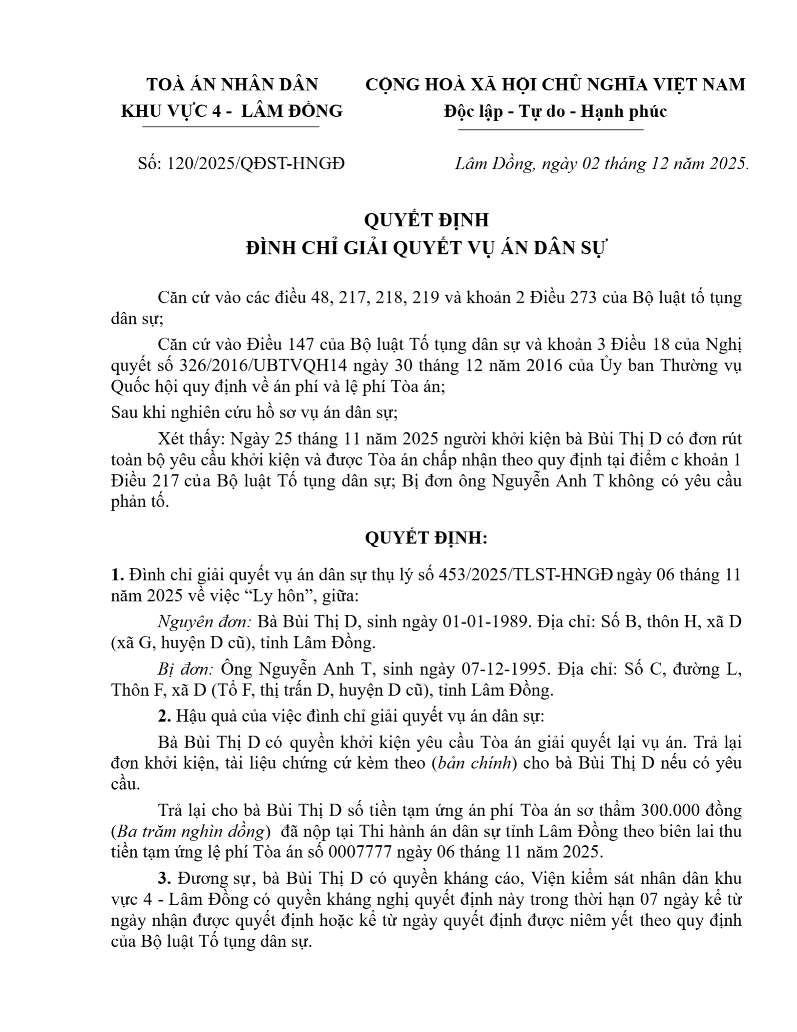 | Tòa án xét xử: | Tòa án nhân dân khu vực 4 - Lâm Đồng, tỉnh Lâm Đồng |