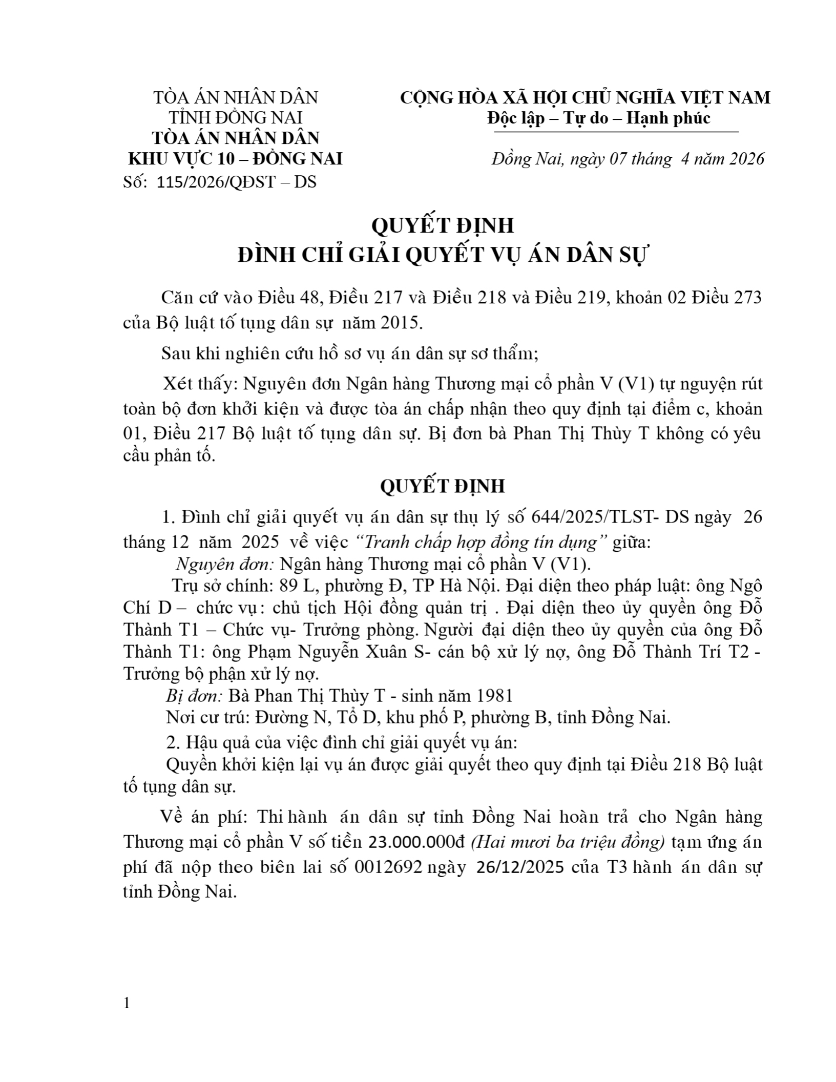 | Thông tin về vụ/việc: | Quyết định đình chỉ 115 /2025/QđST-DS ngày 07/4/2026 |