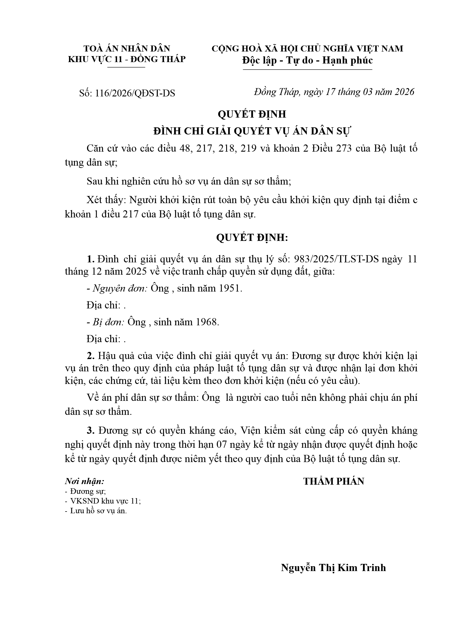 | Tên Quyết định: | Quyết định số 116/2026/QĐST-DS ngày 17/03/2026 của Tòa án nhân dân khu vực 11 - Đồng Tháp, tỉnh Đồng Tháp về tranh chấp quyền sử dụng đất |