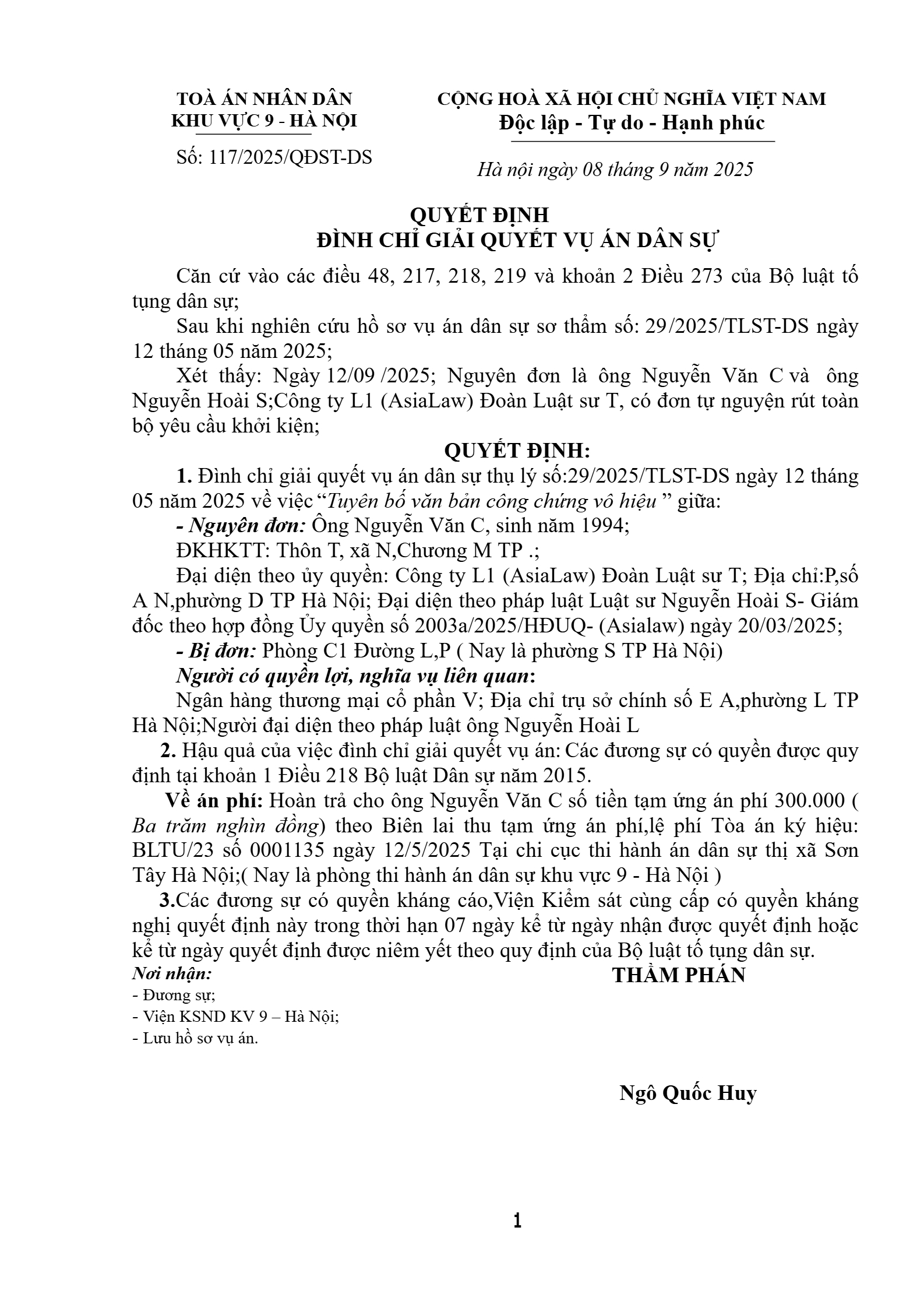 Quyết định số 117/2025/QĐST-DS ngày 08/09/2025 của Tòa án nhân dân khu vực 9 - Hà Nội, TP. Hà Nội về y/c tuyên bố văn bản công chứng vô hiệu
