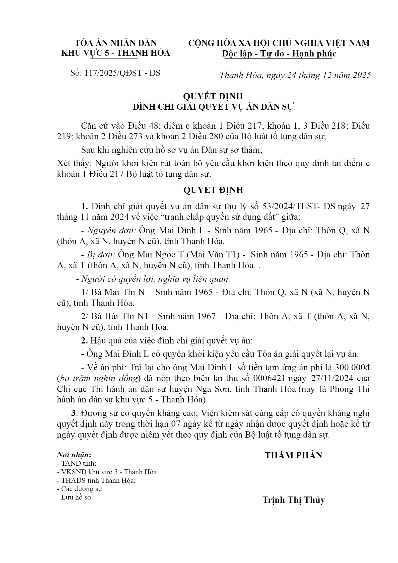 Quyết định số 117/2025/QĐST-DS ngày 24/12/2025 của Tòa án nhân dân khu vực 5 - Thanh Hóa, tỉnh Thanh Hóa về tranh chấp đất đai