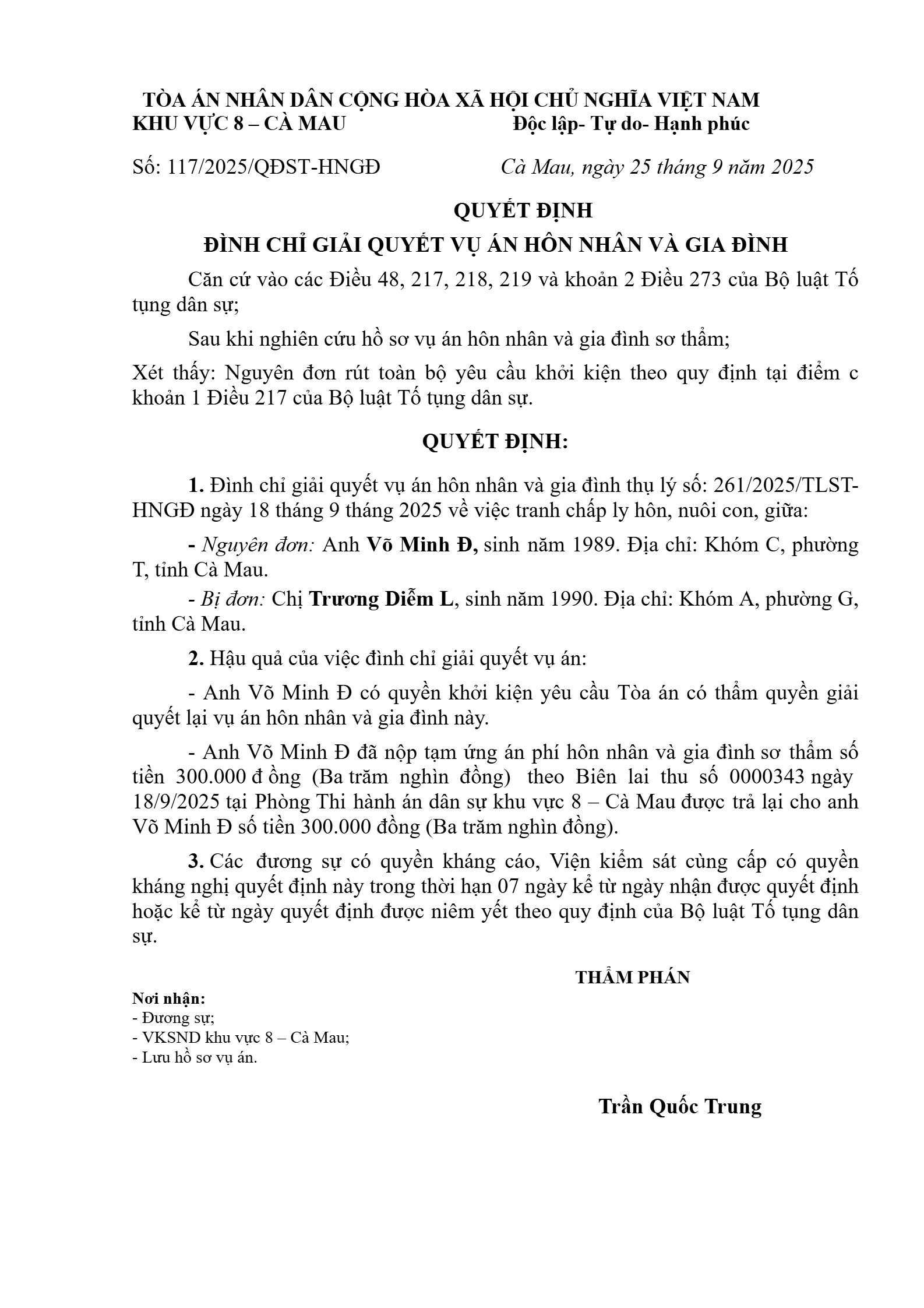 Quyết định số 117/2025/QĐST-HNGĐ ngày 25/09/2025 của Tòa án nhân dân khu vực 8 - Cà Mau, tỉnh Cà Mau về vụ án ly hôn về mâu thuẫn gia đình